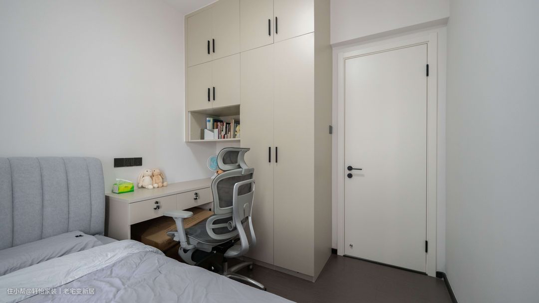 次卧床品以灰色为主色调,衣柜和书桌的完美结合,不仅方便收纳衣物和书籍,还能节省空间,让整个卧室看起来更加整洁有序,展现出一种现代简约的生活态度。
