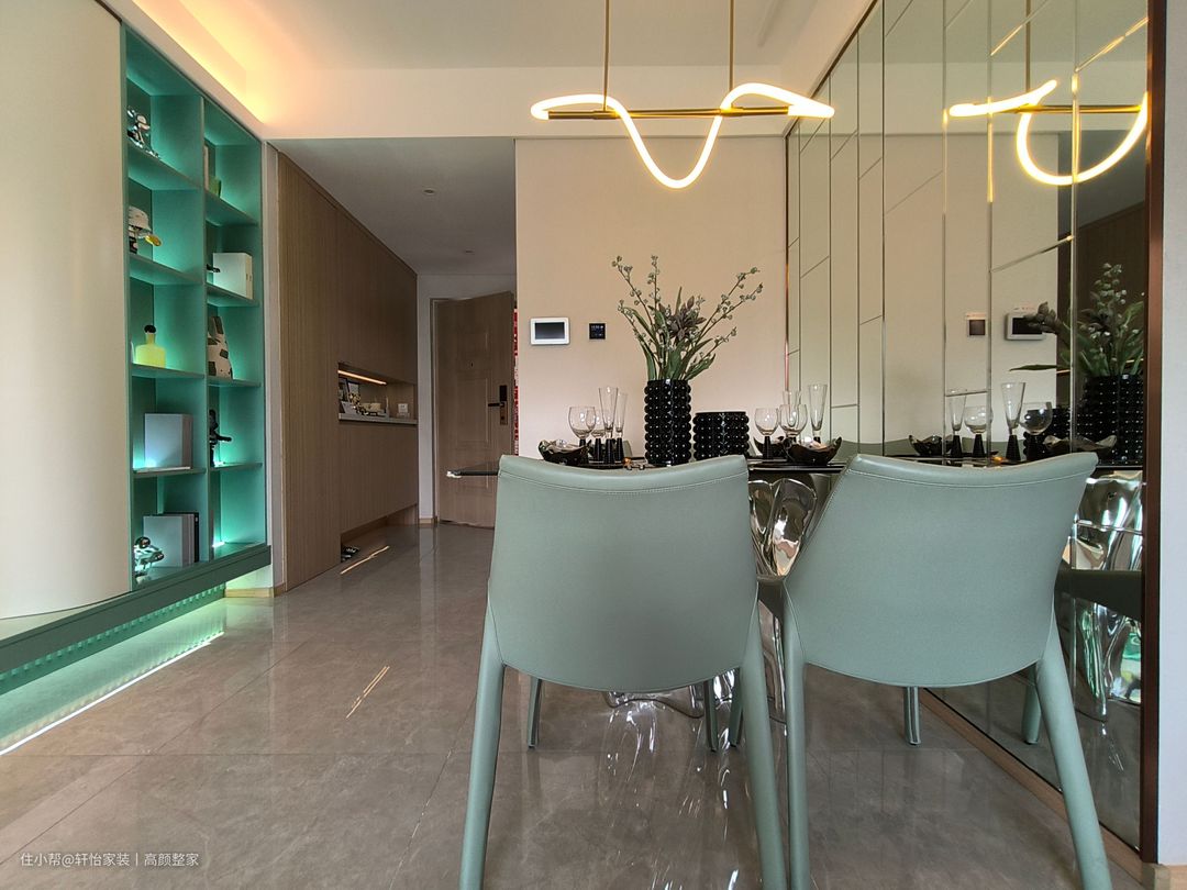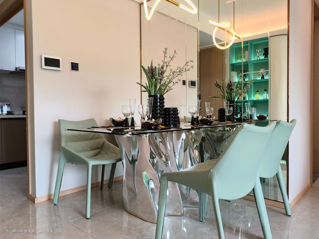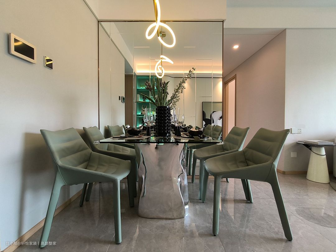 餐桌整齐地设置在墙壁边缘,四人桌。一侧专门制作了具有设计感的壁龛,内部涂满浓郁的翠绿色,与餐椅的配色形成了和谐的呼应。顶部的吊灯其形状如同一条蜿蜒流动的河水,充满动感。 镜面餐桌支柱以其独特的设计,将空间的宽广感提升到新的层次。镜面的魔力不仅限于此,墙壁也被镜面所覆盖,仿佛进入了一个没有界限的空间。镜面墙壁不仅让餐厅充满了无限的扩展感,金属元素的巧妙运用更是使这个餐厅散发出一种强烈的奢华气息。