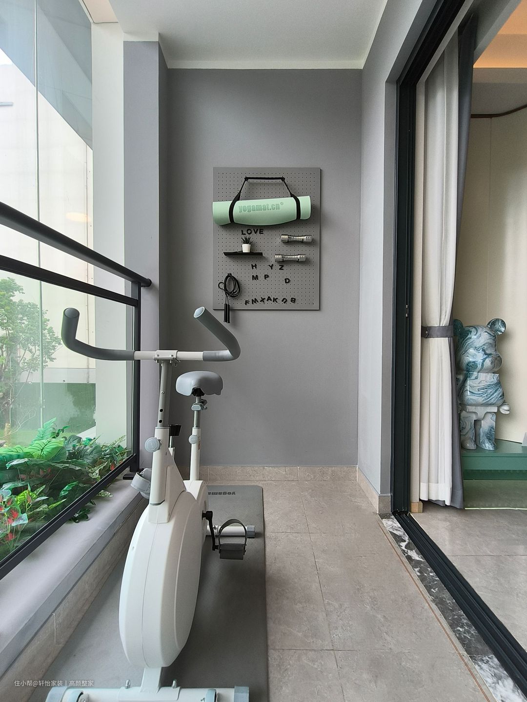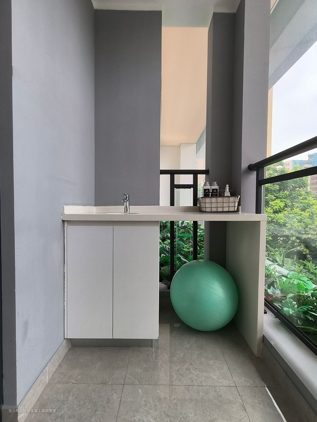 通过构建阳台为专属于主人的健身空间,并在其侧边安装定制的柜台和洗手台,既拥有收纳空间,也可以轻松地避免运动结束后必须前往卫生间进行清洁擦拭的繁琐过程。