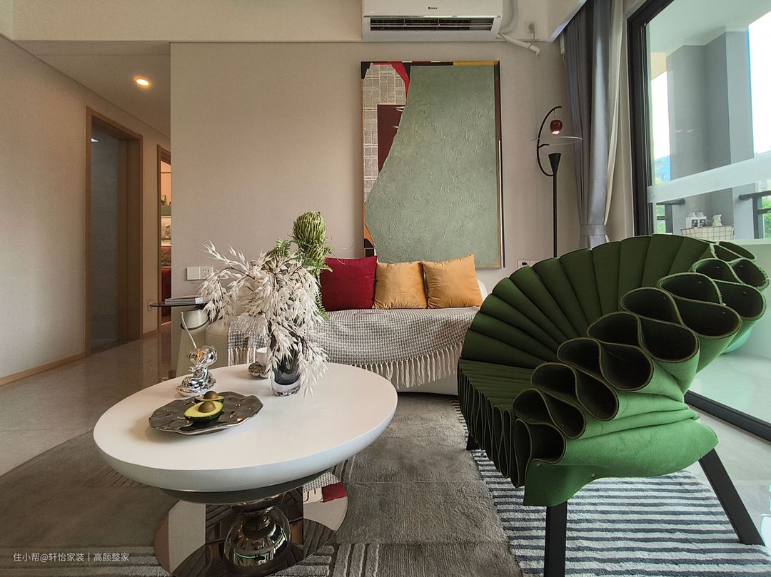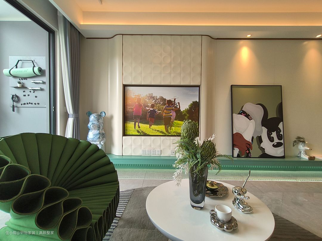 客厅将皮质沙发与地毯形状融合,沙发的曲线设计与地毯的弧形相得益彰,营造出一种流畅而和谐的感觉。侧边吊顶上,非传统的橙色轨道灯光洒在地面上,与弧形地毯相互交融,整个空间仿佛被温暖的橙色光线包围着。沙发上放置与橙色调相协调的色彩,以营造出更具层次感的氛围。茶几绿植的点缀也为空间增添一份生机与自然之美。 以流畅曲线造型的电视背墙,设计主题聚焦于水滴立体形状背景墙,巧妙展现意大利风格。下方设置翠绿色一字型底柜,有效降低清洁负担,且延伸至餐厅区域,实现餐厅与客厅风格的完美融合,底柜位置摆放艺术画作及玩具更能展现主人品味。 弧形绿色单人座椅以其高贵典雅的翠绿色泽装饰着客厅,为了体现其轻巧便携的特性,我们选择了白色的圆形茶几,茶几的尺寸小巧精致,适合摆放在任何地方,轻松融入各种空间。