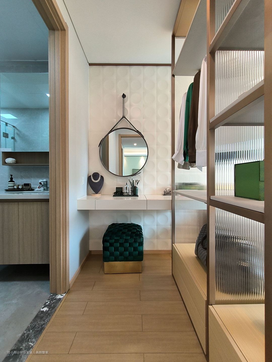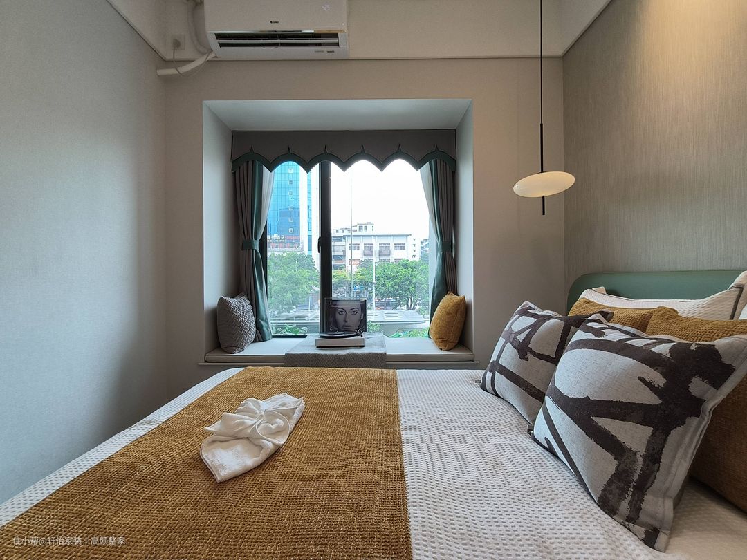 主卧几何形状护墙板跳脱传统呆板样式,充满意式风情,线性艺术吊灯在床侧不仅增加氛围感,在晚上躺在飘窗阅读也别具一格,顶部射灯搭配轨道灯更有家的温馨。 主卧衣柜框架采用高品质金属边框,赋予了衣柜独特的轻奢感。门面选用了长虹玻璃推拉门,长虹玻璃的独特质感和光线的穿透性,使得衣柜内的物品一览无余,同时也为卧室带来了更多的采光,推拉门的设计使得开关更加顺畅,不占用额外的空间。内部设计提供了多层抽屉和隔板,以便更方便地分类和存放衣物、鞋帽和配饰等物品。 将梳妆台与床具分隔于衣柜两端,利用悬空的梳妆台并搭配悬挂式镜子,有效减少空间占用并赋予其简约与现代化的气息。