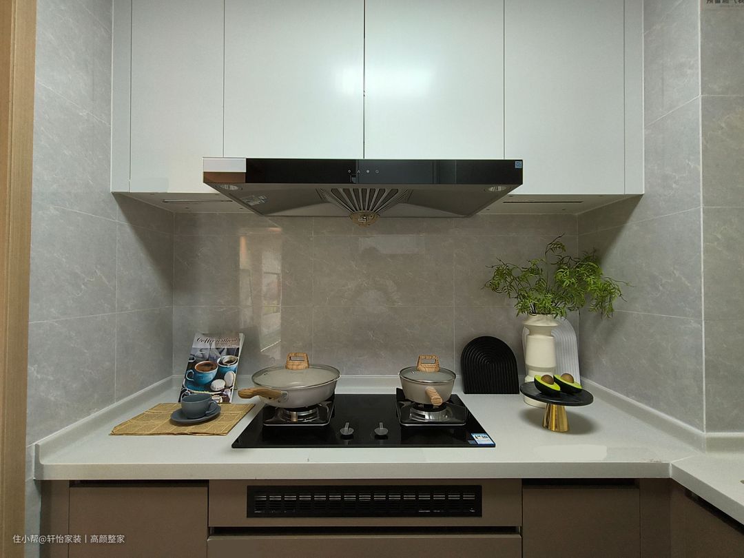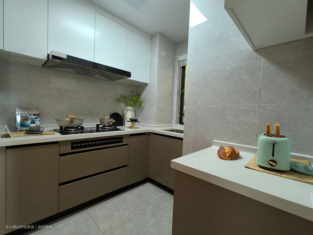 G型厨房布局采纳了定制的咖色地柜与浅色哑光吊柜,塑造出了和谐的视觉效果。搭配两个燃气灶台,实现了多个菜品同时处理的功能,有效提升了工作效率。为了提升墙壁的触感,我们选用了大理石作为装饰材料。大理石的纹理和光泽赋予厨房一丝奢华气息,同时,易清洁的特性使得厨房始终保持明亮和整洁