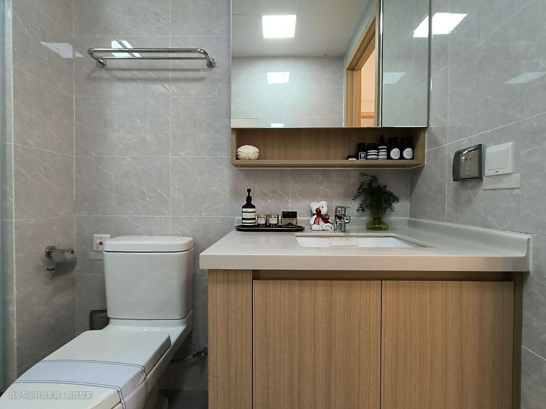 卫生间为了营造舒适的环境感,选择了光面大理石地砖作为地面材质。光面大理石地砖不仅具有通透感,还能够反射光线,使整个空间更加明亮开阔。干湿分离采用了玻璃隔断来分隔淋浴区和洗手台区域。这种设计不仅美观,还能有效地防止水分溅湿到其他区域,保持整个卫生间的干燥与整洁。 卫生间橱柜通过合理的隔板有效地储存和分类各类卫生用品,让空间更加整洁有序。为了保证安全与防水性能,插座被防水盒包裹。这项设计细节不仅考虑了日常使用的便利性,还兼顾了家庭成员的安全。防水盒的设计使得插座在湿润环境下也能正常使用,避免了电器与水分接触造成的潜在危险。镜柜下方的开放式设计,可以摆放一些常用的卫生用品或装饰品,方便取用并增加了空间的层次感。而镜柜下方的储物空间则可以存放较多的物品,保持卫生间整洁有序。