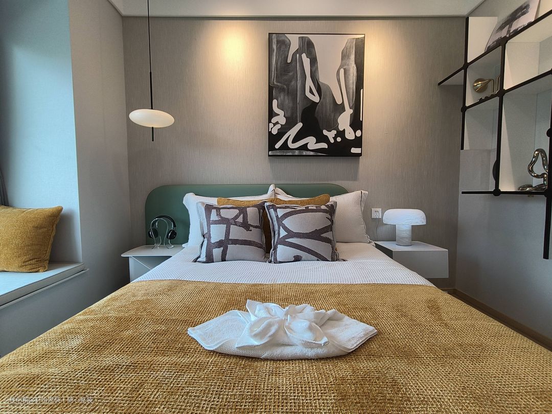 对于次卧的装饰方案,削减了留宿客人的储藏空间,在此基础上强化了墙面设计的艺术感。其中,黑色金属搁板的墙面布局为房间提供了视觉焦点,同时,一幅黑色抽象的装饰画也为整个空间的设计风格注入了艺术气息。