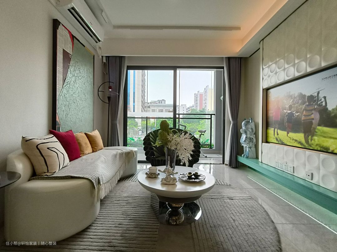 客厅将皮质沙发与地毯形状融合,沙发的曲线设计与地毯的弧形相得益彰,营造出一种流畅而和谐的感觉。侧边吊顶上,非传统的橙色轨道灯光洒在地面上,与弧形地毯相互交融,整个空间仿佛被温暖的橙色光线包围着。沙发上放置与橙色调相协调的色彩,以营造出更具层次感的氛围。茶几绿植的点缀也为空间增添一份生机与自然之美。 以流畅曲线造型的电视背墙,设计主题聚焦于水滴立体形状背景墙,巧妙展现意大利风格。下方设置翠绿色一字型底柜,有效降低清洁负担,且延伸至餐厅区域,实现餐厅与客厅风格的完美融合,底柜位置摆放艺术画作及玩具更能展现主人品味。 弧形绿色单人座椅以其高贵典雅的翠绿色泽装饰着客厅,为了体现其轻巧便携的特性,我们选择了白色的圆形茶几,茶几的尺寸小巧精致,适合摆放在任何地方,轻松融入各种空间。