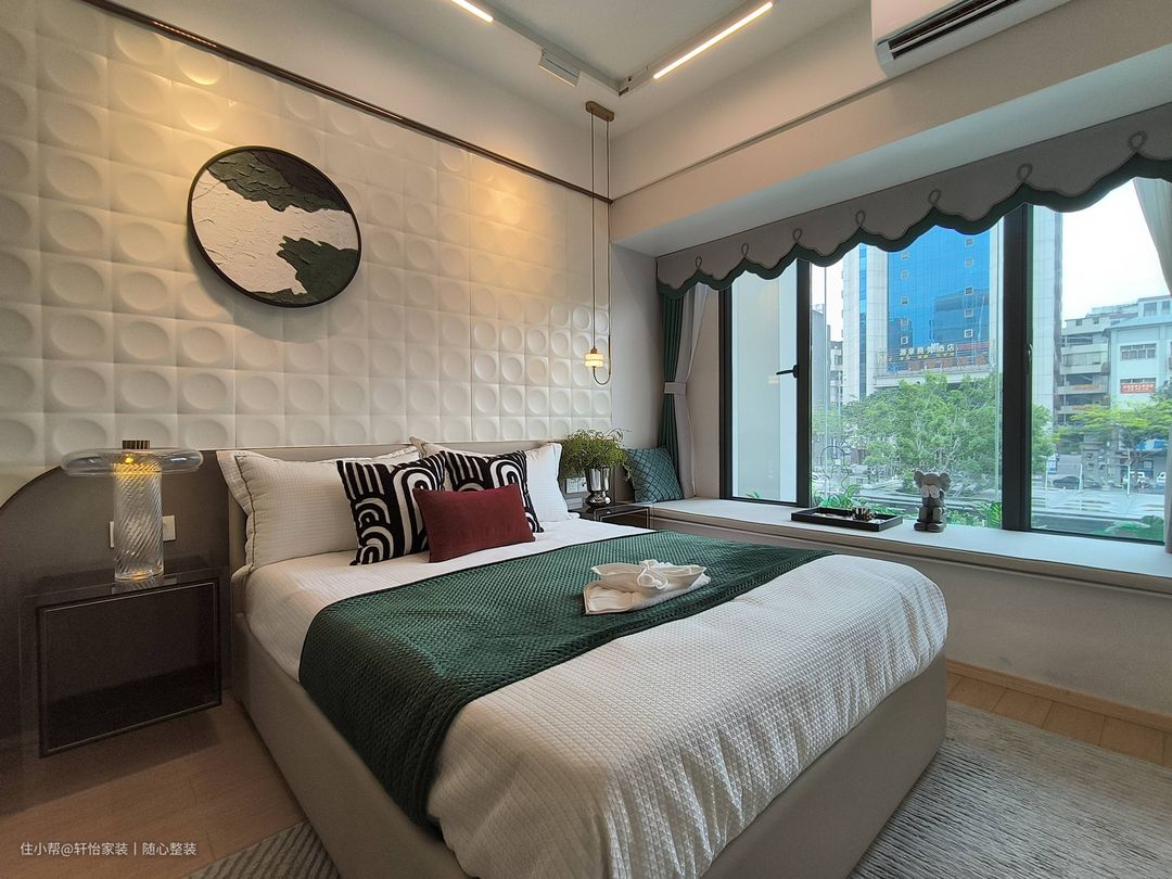 主卧几何形状护墙板跳脱传统呆板样式,充满意式风情,线性艺术吊灯在床侧不仅增加氛围感,在晚上躺在飘窗阅读也别具一格,顶部射灯搭配轨道灯更有家的温馨。 主卧衣柜框架采用高品质金属边框,赋予了衣柜独特的轻奢感。门面选用了长虹玻璃推拉门,长虹玻璃的独特质感和光线的穿透性,使得衣柜内的物品一览无余,同时也为卧室带来了更多的采光,推拉门的设计使得开关更加顺畅,不占用额外的空间。内部设计提供了多层抽屉和隔板,以便更方便地分类和存放衣物、鞋帽和配饰等物品。 将梳妆台与床具分隔于衣柜两端,利用悬空的梳妆台并搭配悬挂式镜子,有效减少空间占用并赋予其简约与现代化的气息。