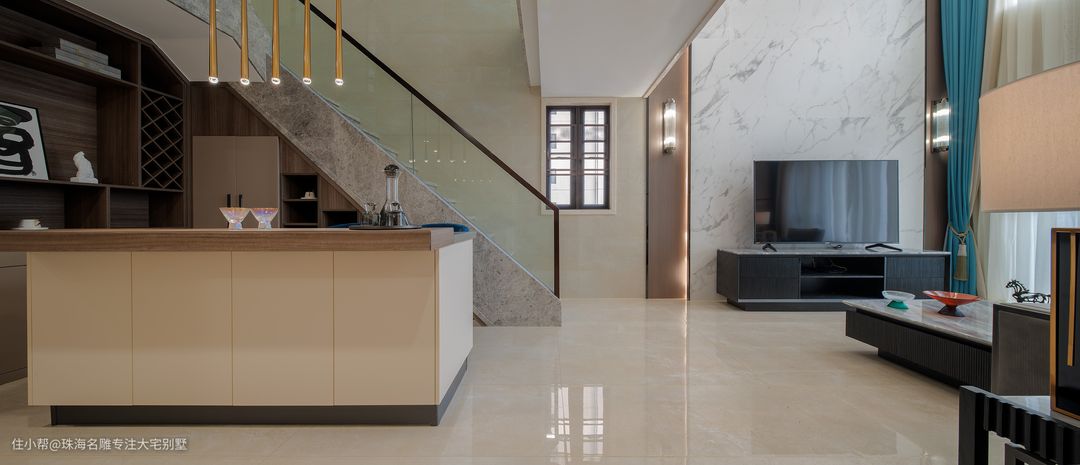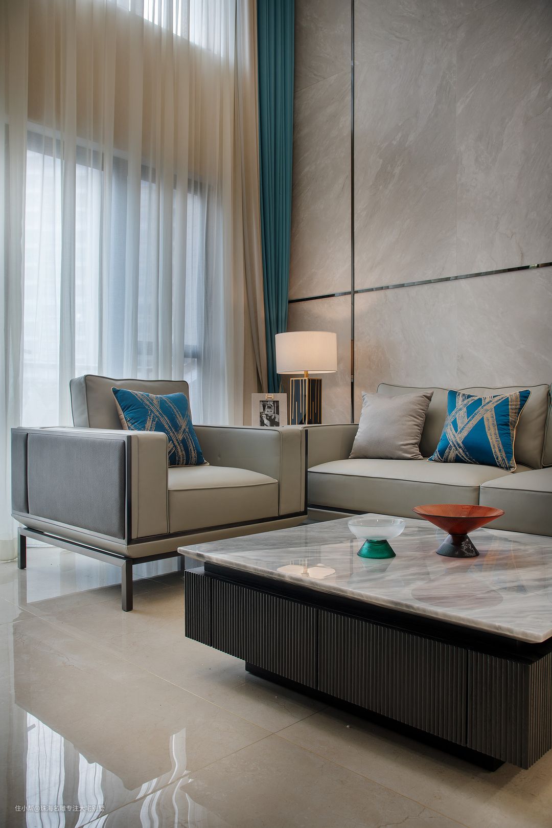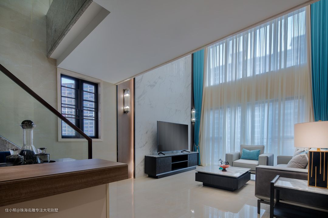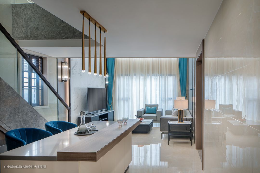 雅棕的地面透露着柔和气息,而蓝白的经典组合每个空间都有属于自己的性格颜色,设计师对于色彩和明暗的处理有着独特的印记。