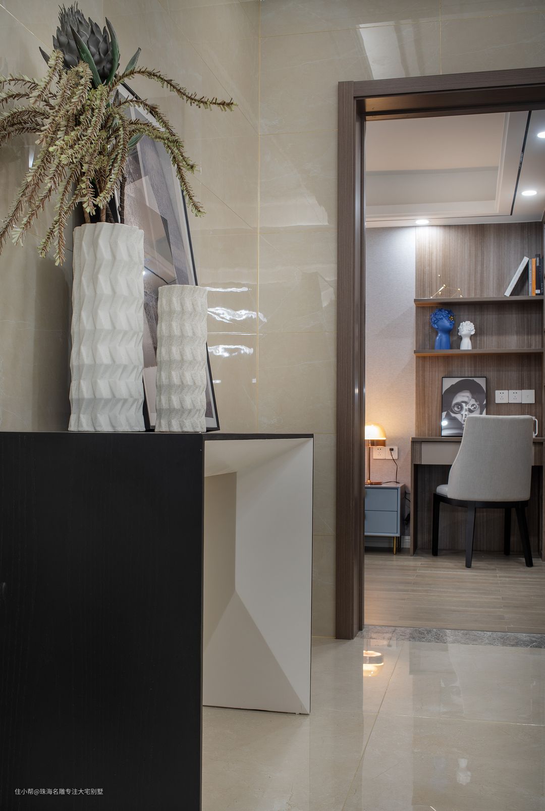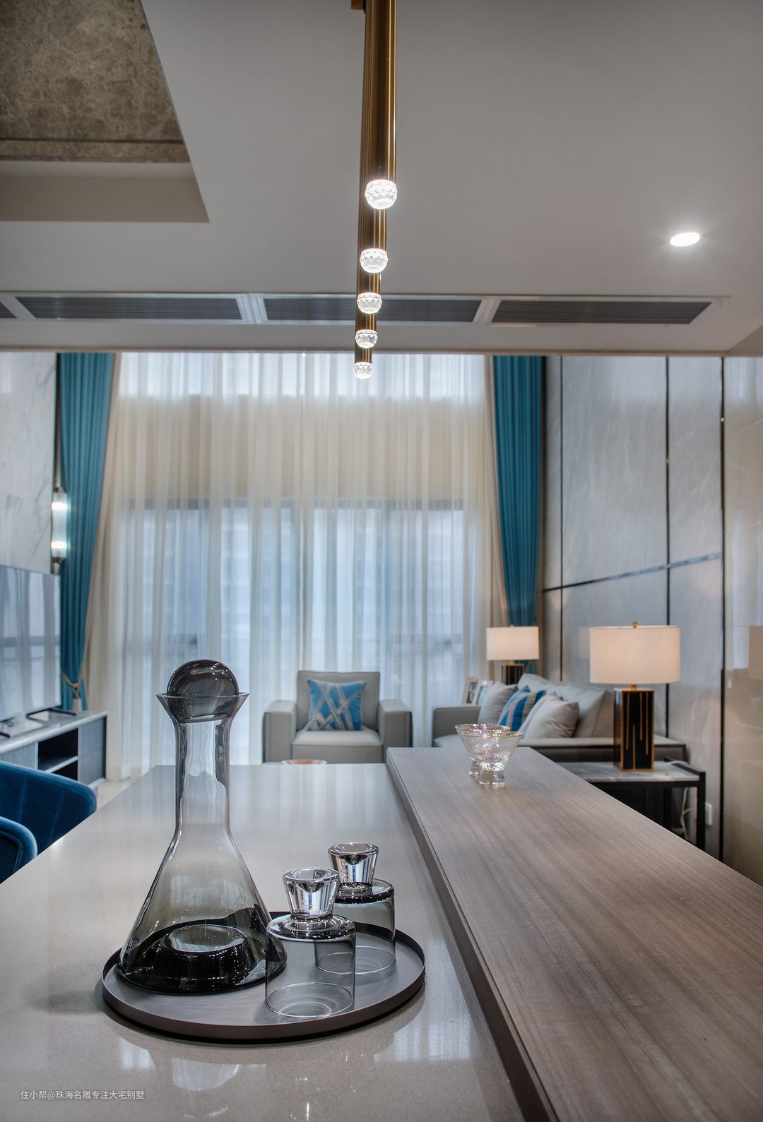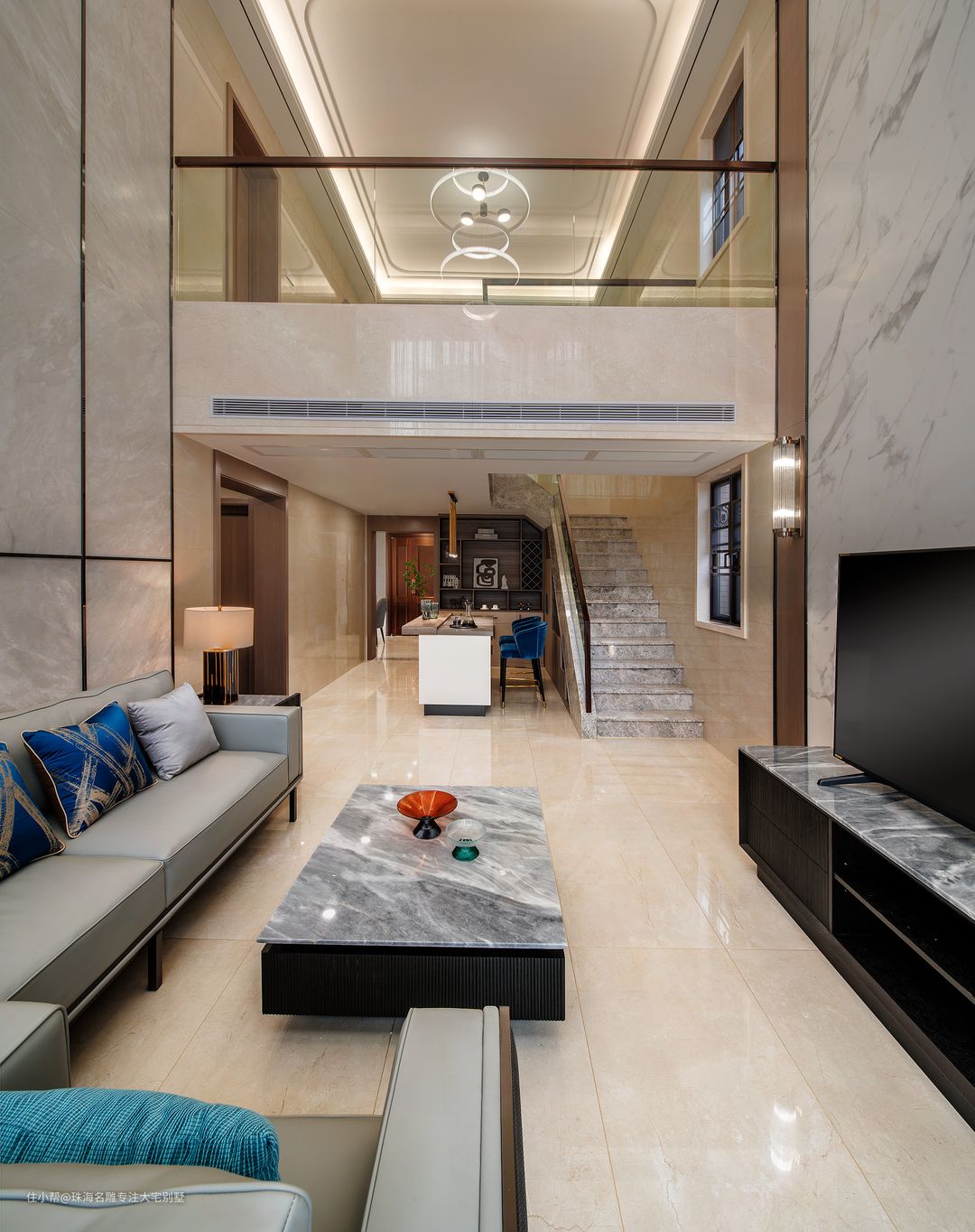 雅棕的地面透露着柔和气息,而蓝白的经典组合每个空间都有属于自己的性格颜色,设计师对于色彩和明暗的处理有着独特的印记。