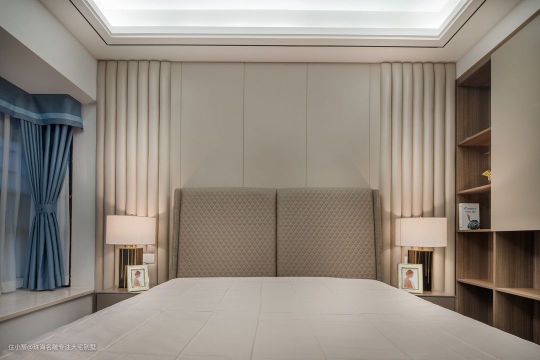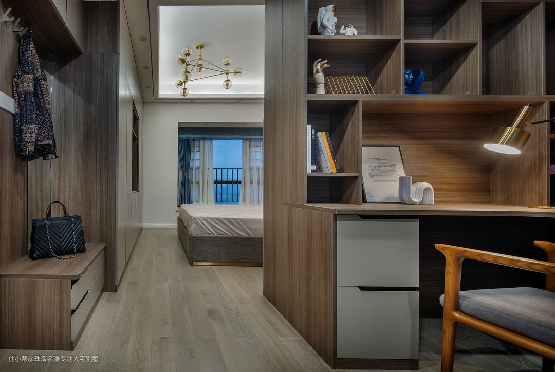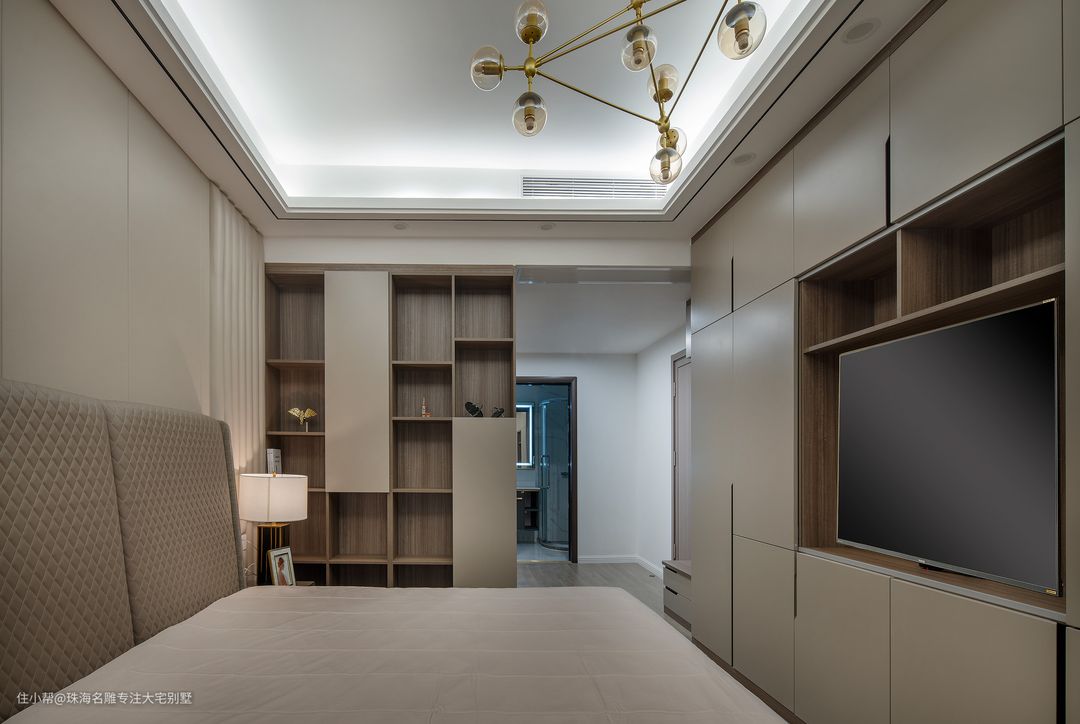 设计师以隔断的手法实现了主卧空间的界定,将衣帽间置于床的后侧方,深色的柜体高级而有质感,通透的材质对空间形成良好的视觉延伸,从而提升空间的体验。