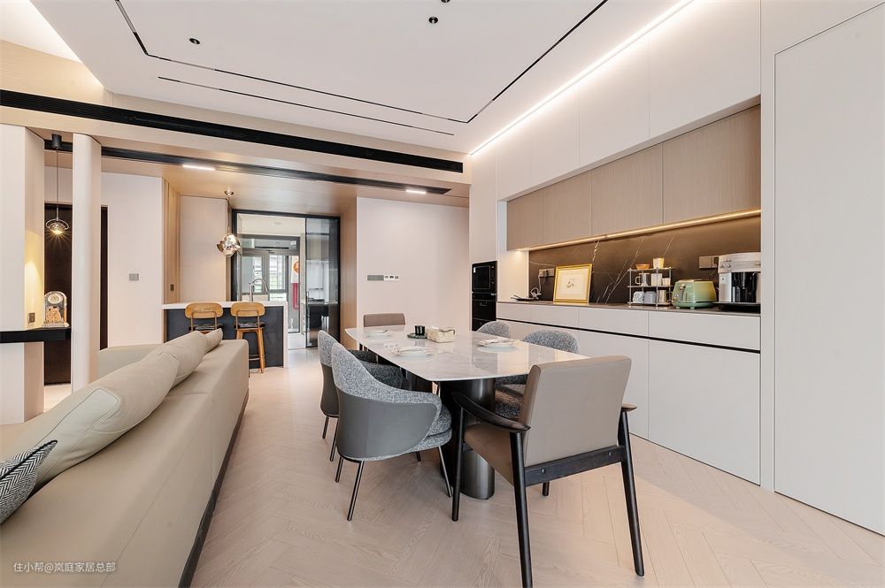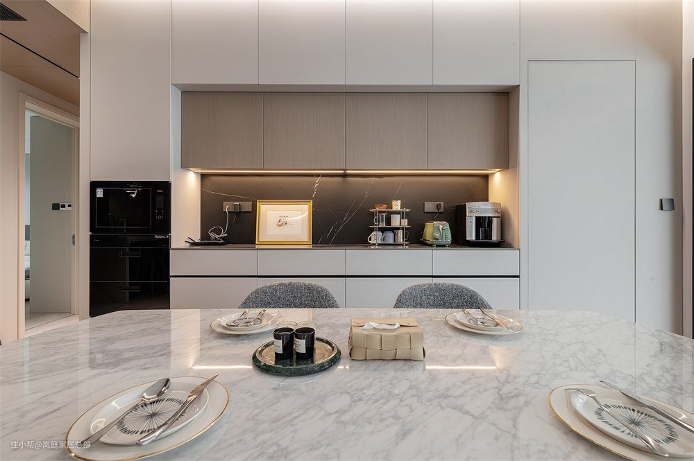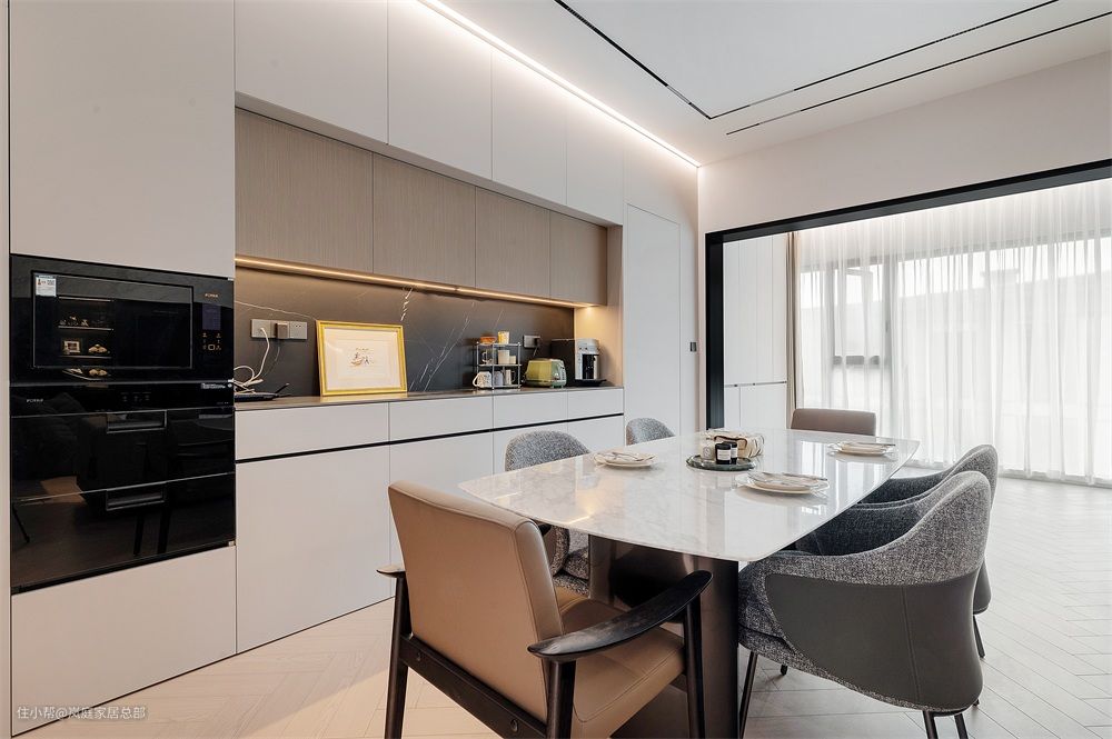 餐厅的设计跟客厅是呼应的,和沙发配套的餐桌椅,同款灰色的造型,保证空间的和谐美观性。 靠墙一侧则是做了一整面的餐边柜,一体式的白色柜子,和电视背景墙做到了前后呼应。简简单单的配色,却更百搭。 中间做了留空,预留出插座,小家电使用更方便。侧边还将蒸烤箱嵌入,美观又实用。