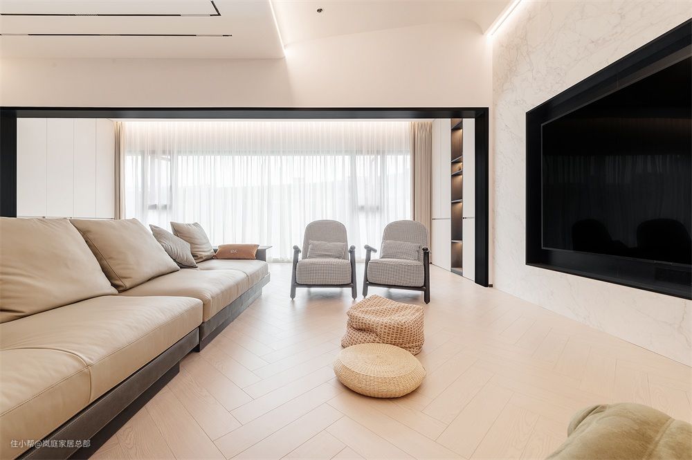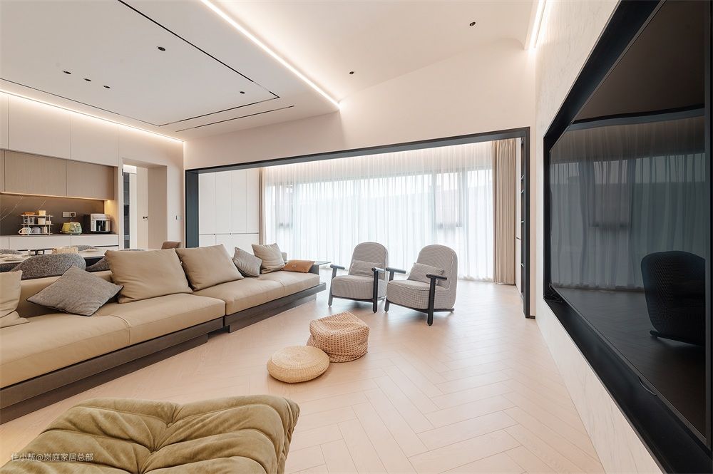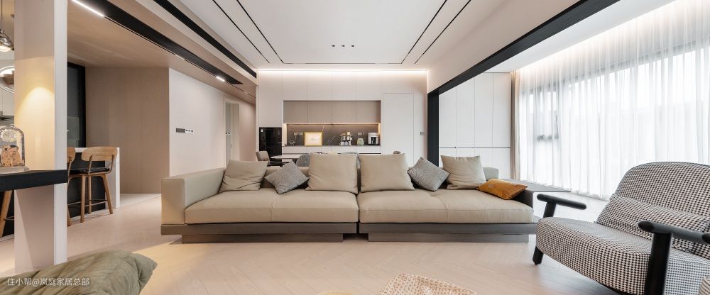 为了保留空间最大的开阔度,所以客餐厅之间没有做隔断,空间看上去也更显宽敞大气。吊顶都是一体式的无主灯设计,简约精致,不压层高。 软装方面的搭配也都是比较简约的款式,灰色的皮质沙发,兼顾到颜值和舒适度。加入少量的跳脱色彩,增加空间的层次感。 同时舍弃了传统的茶几,放大空间,以此打造出一个更宽敞的休闲娱乐空间。草编的蒲团,也更容易营造温润清新的舒适气息。