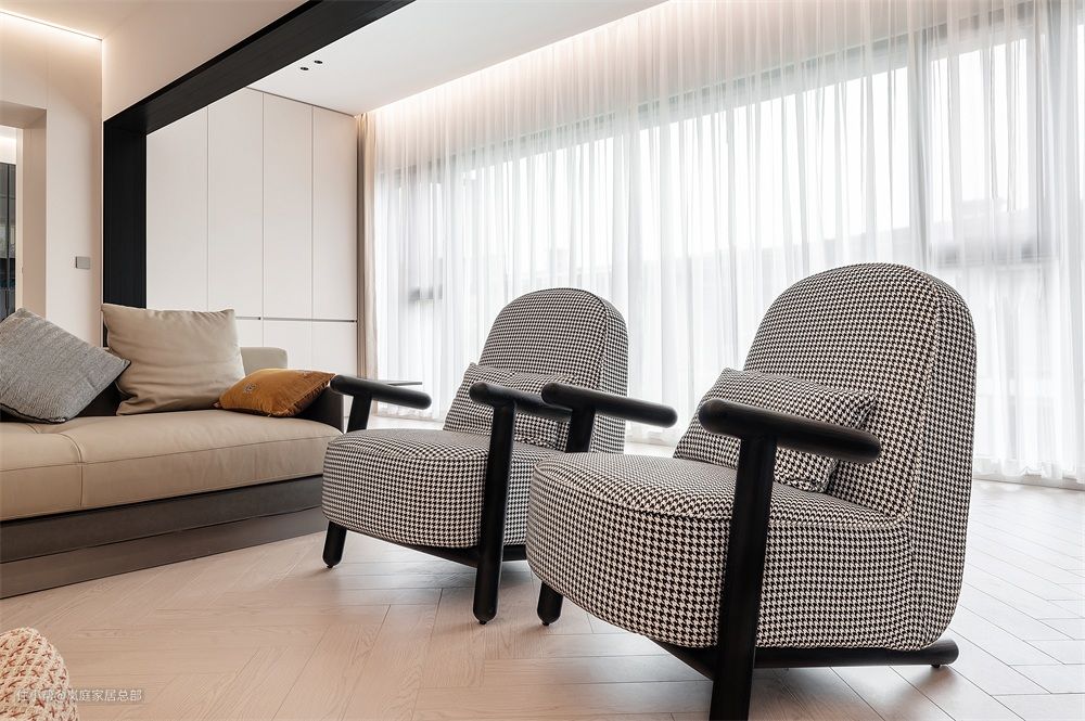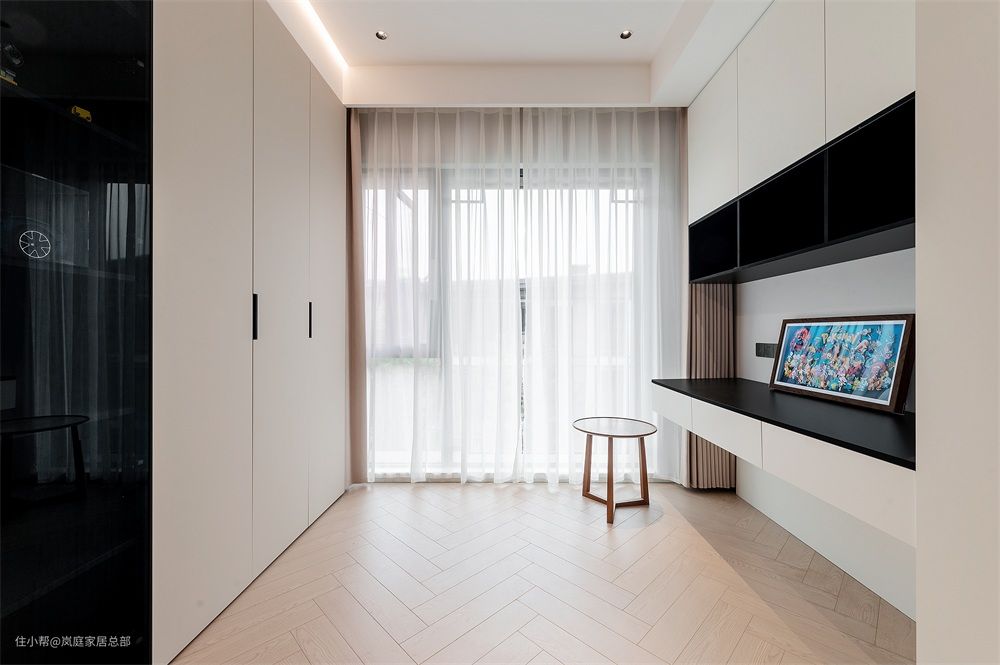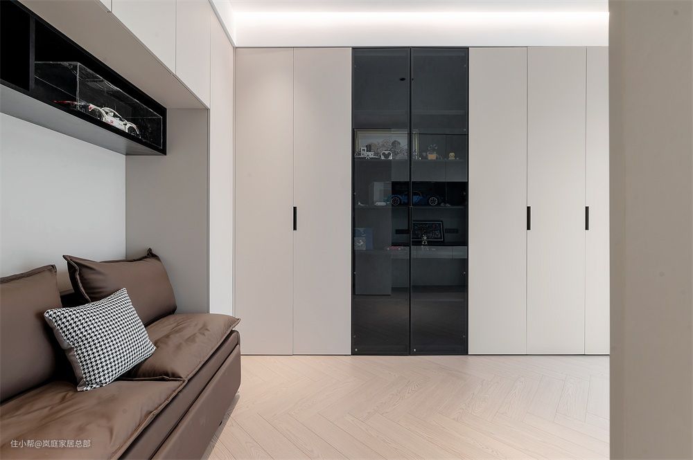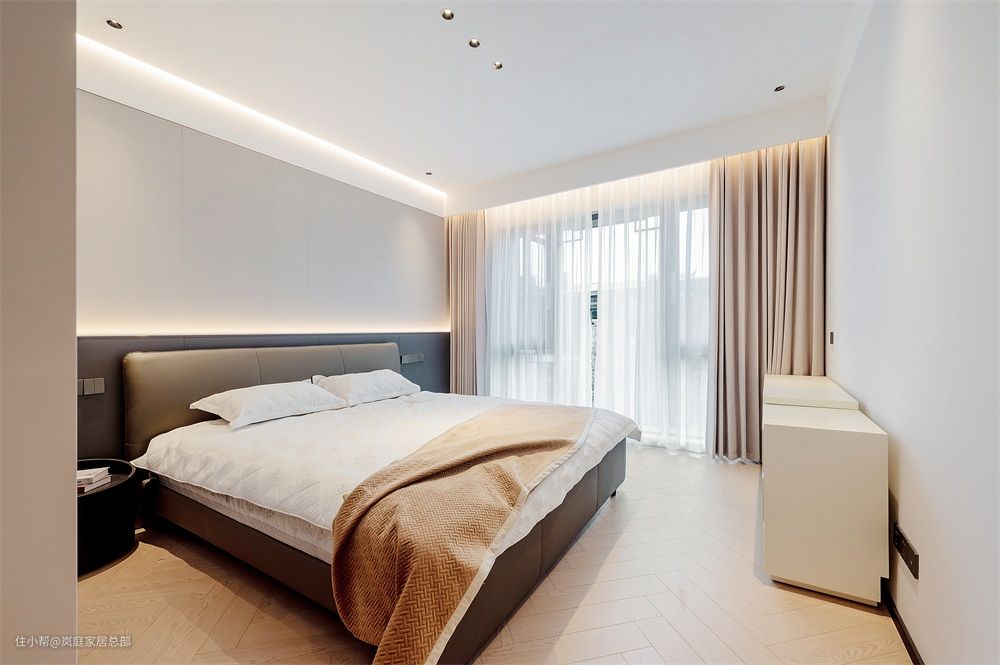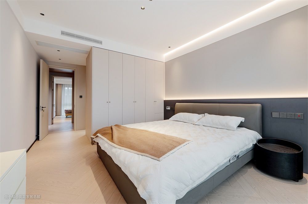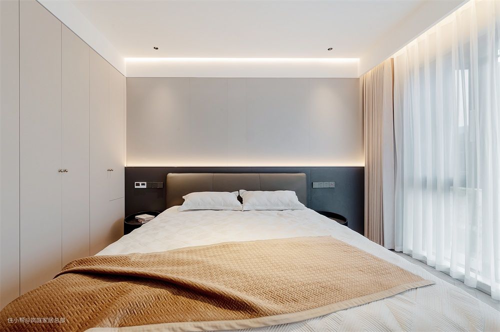 主卧在业主的要求下增加了衣帽间、;L型的衣帽间,储物功能强大,也避免了卫生间对着床头。 跟公区一样都做了落地窗封窗,也延续了无主灯的设计,加上悬浮式吊顶,简约而不简单的设计,轻松凸显高级范儿。 床头背景墙采用上下拼接的处理,黑色木板上墙,跟灰色的护墙板结合,深浅叠加,空境的层次感更加丰富。