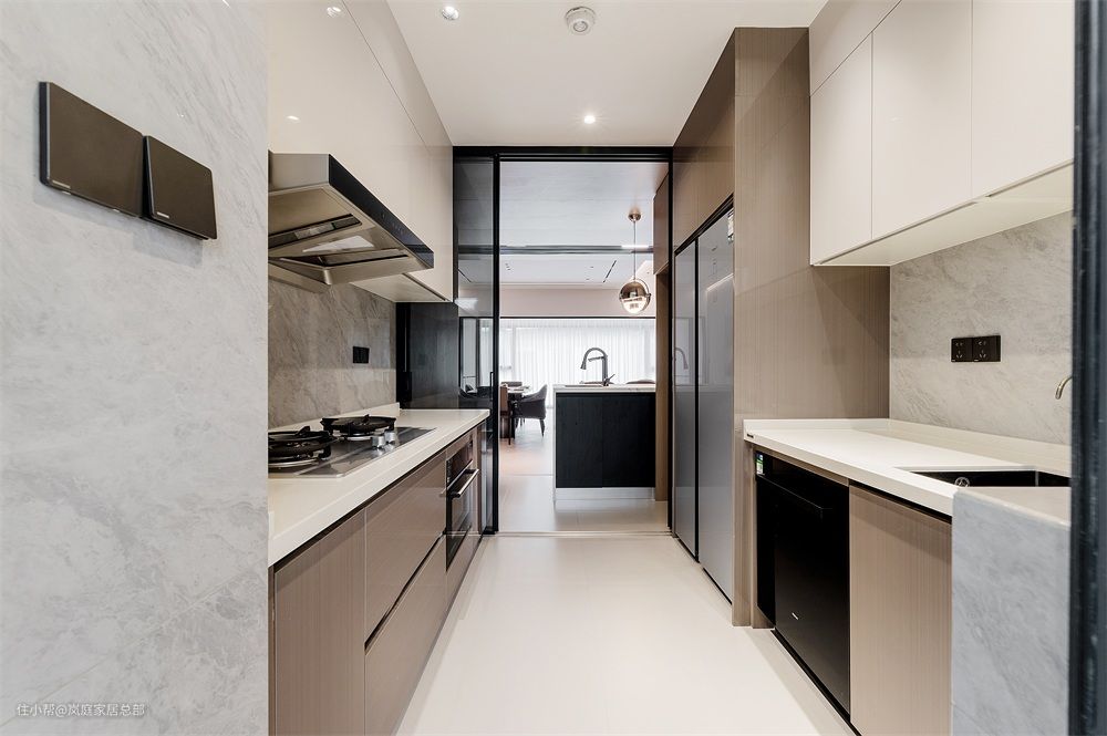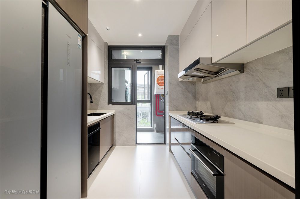 厨房面积较大,做了双一字型的经典橱柜布局,功能区划分明确,家里人多的时候一起做饭也不会拥挤。 侧边做高柜将冰箱嵌入,美观又实用,不浪费空间。两侧的墙面上方都做了吊柜,大大增加了储物空间,无把手的柜子,看上去更简洁大方。 厨房还带有生活阳台,选择了透光性号的玻璃门做隔断,既不影响采光,也避免了油烟污染的问题。