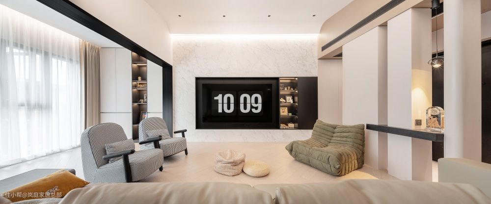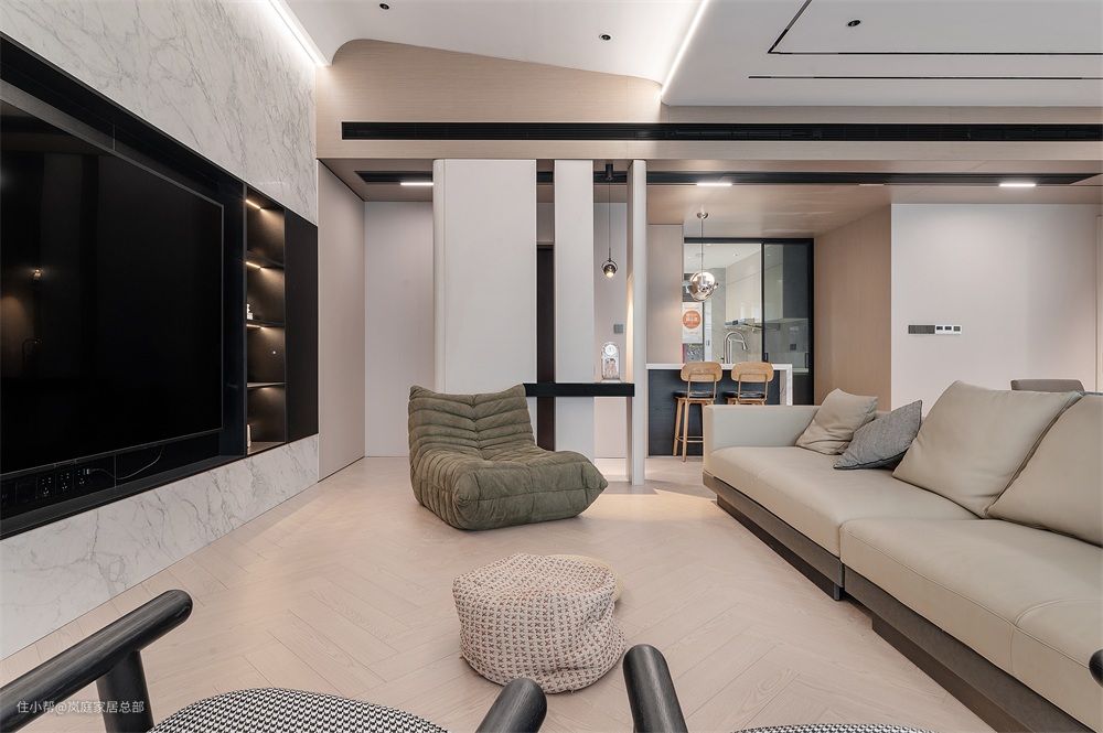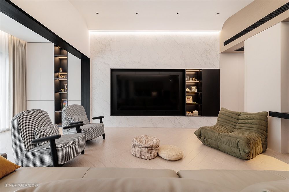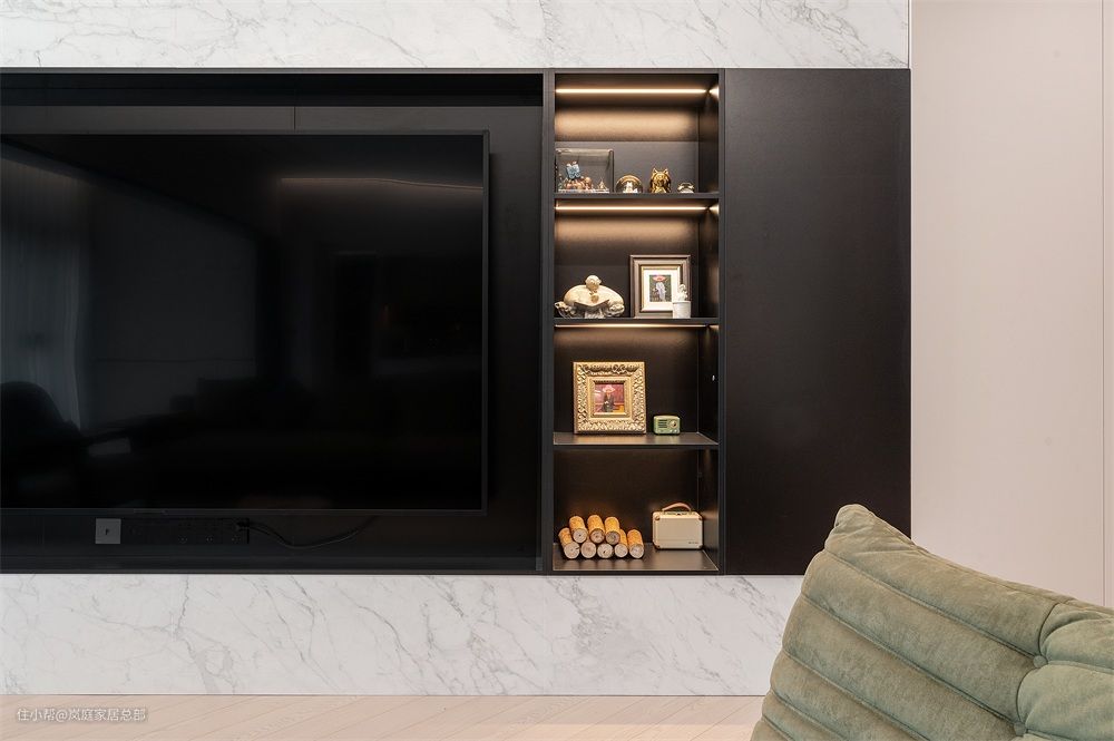 这个家是横厅户型,一来就将客餐厅和阳台打通做了落地窗封窗,搭配上梦幻帘,有效增加室内采光,视觉上也得到放大的效果。 另外还可以看到在阳台两侧也都做了储物柜增加收纳空间,都是统一定制的到顶设计,收纳超足,也做到空间不浪费。 客餐厅的吊顶也舍弃了传统设计,而是用了拼接处理。流行的悬浮式设计加上独特的斜面吊顶,给人一种不一样的视觉体验,也更显高级和精致。 电视背景墙的设计在现在流行的基础上做了创新,舍弃悬浮式的设计,直接做落地式的岩板背景墙,中间预留出足够的位置将电视机嵌入,美观又实用。 侧边还做了一体式的壁龛储物柜,少量的明格设计,加入灯带照明,更方便日常拿取储物。 在这里快要清楚看到在客厅侧边砌墙做了隔断,避免开门见厅,也满足了玄关收纳的需求,一举两得超实用。