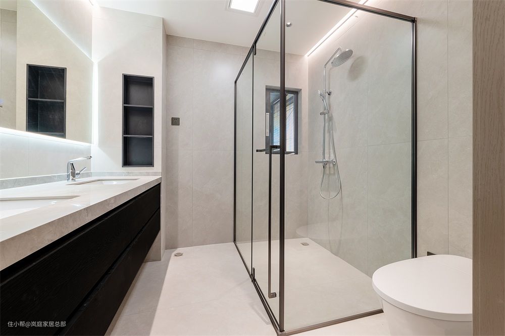 主卫面积很大,首先是根据业主夫妇的需求装了双台盆,一家人早起使用不拥挤。并且还是悬浮式的款式,做到无卫生死角。 带有LED的智能镜柜,储物功能也十分强大。在强侧还做了一个小小的壁龛,增加收纳,提升居住体验。 淋浴区用玻璃门隔断,独立的淋浴房做到了干湿分离。墙地面通铺一体式的灰色瓷砖,更加耐看,也耐脏好打理卫生。
