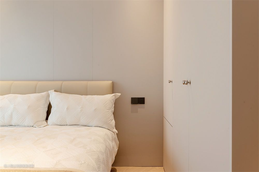 次卧的面积就稍微局促一点,所以在设计上就相对而言简单一点。用灰色乳胶漆通刷背景墙,淡雅又精致的灰色也是这个家的主基调色之一。 床侧做了一组顶天立地的衣柜,特意选用跟背景墙同色,达到一种视觉延伸的效果,空境看上去也更显大。 卧室的地面也延续了公区的木地板通铺,浅色调的木材,让空境都萦绕着一种轻松惬意的氛围感。
