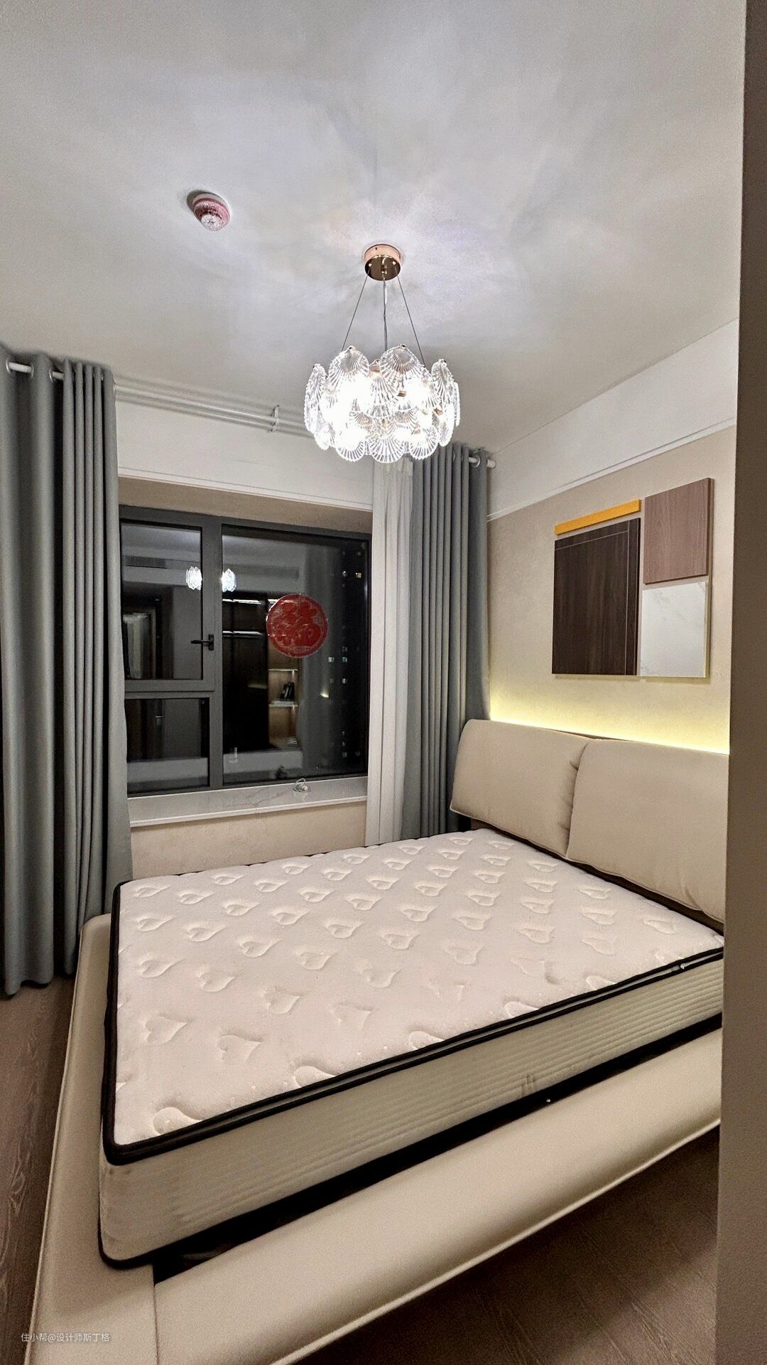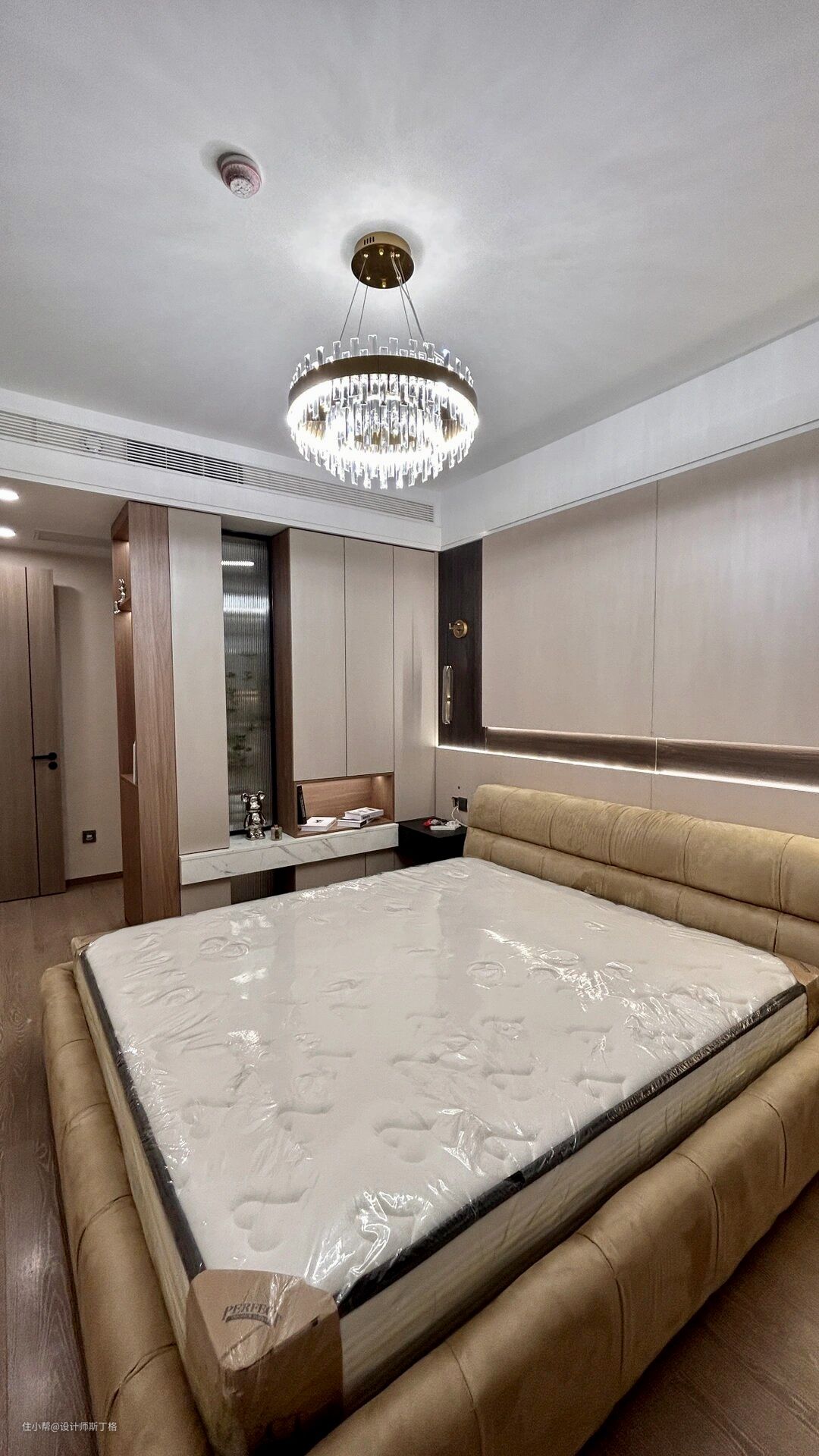 白金软床,浅咖色与空间自然融合,折耳式软包床屏设计,柔美的曲线走向彰显艺术感;齐边框床尾+回形极简床脚,轻盈有力,通透空间。