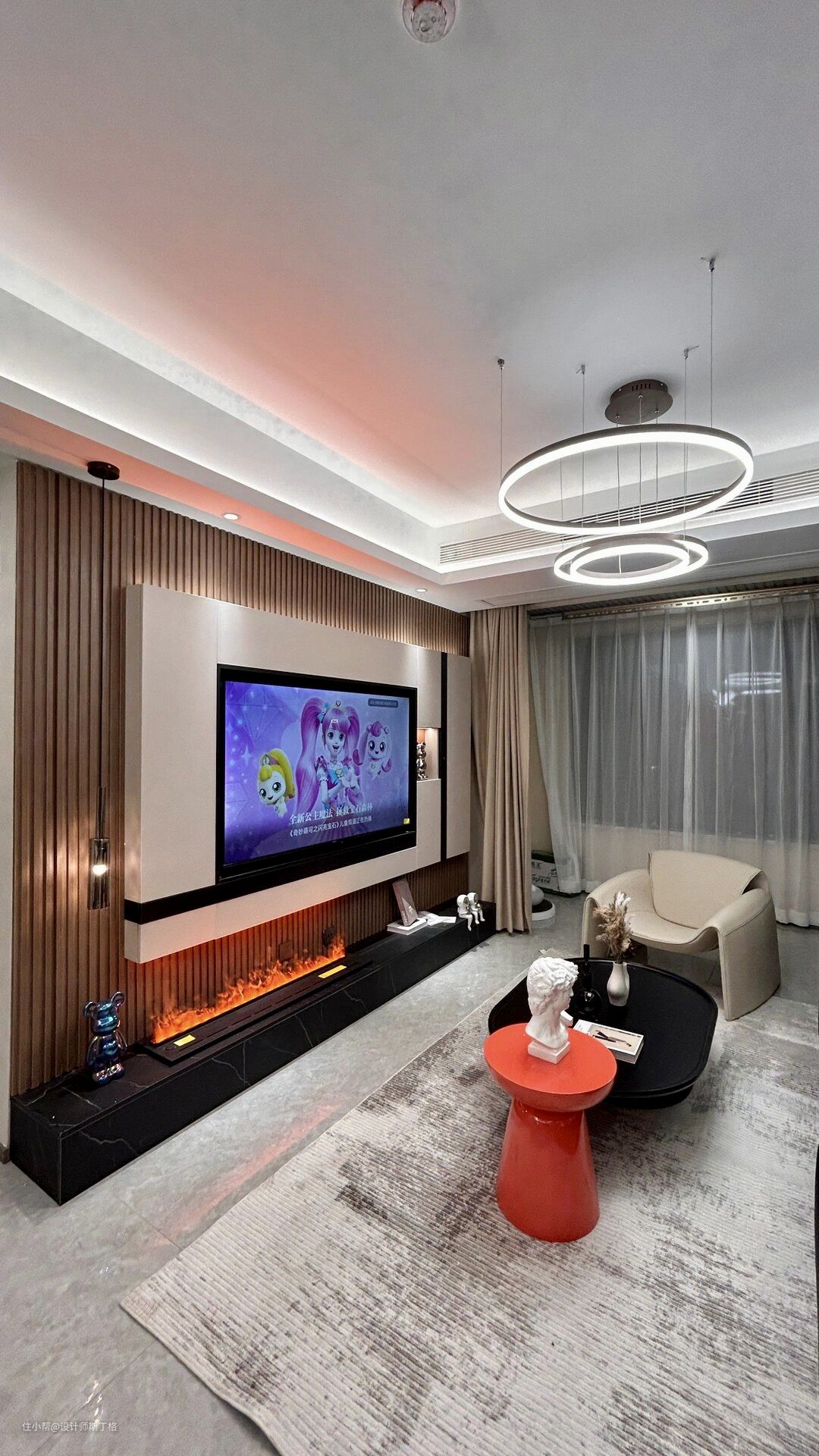 客厅以米咖色和木质作为空间基调,静谧沉稳,保留了开阔的空问感,避免选择过多的物件,简约而精致,沉静却不乏生活温度。
