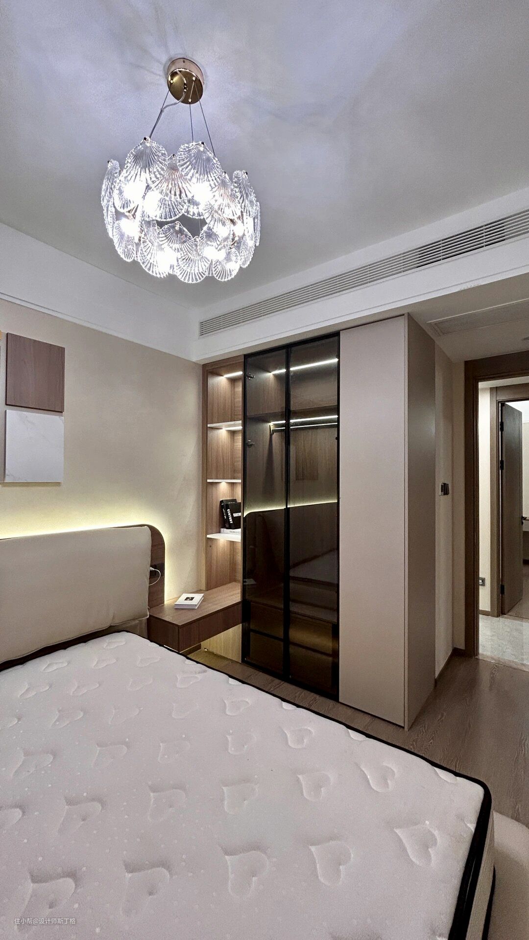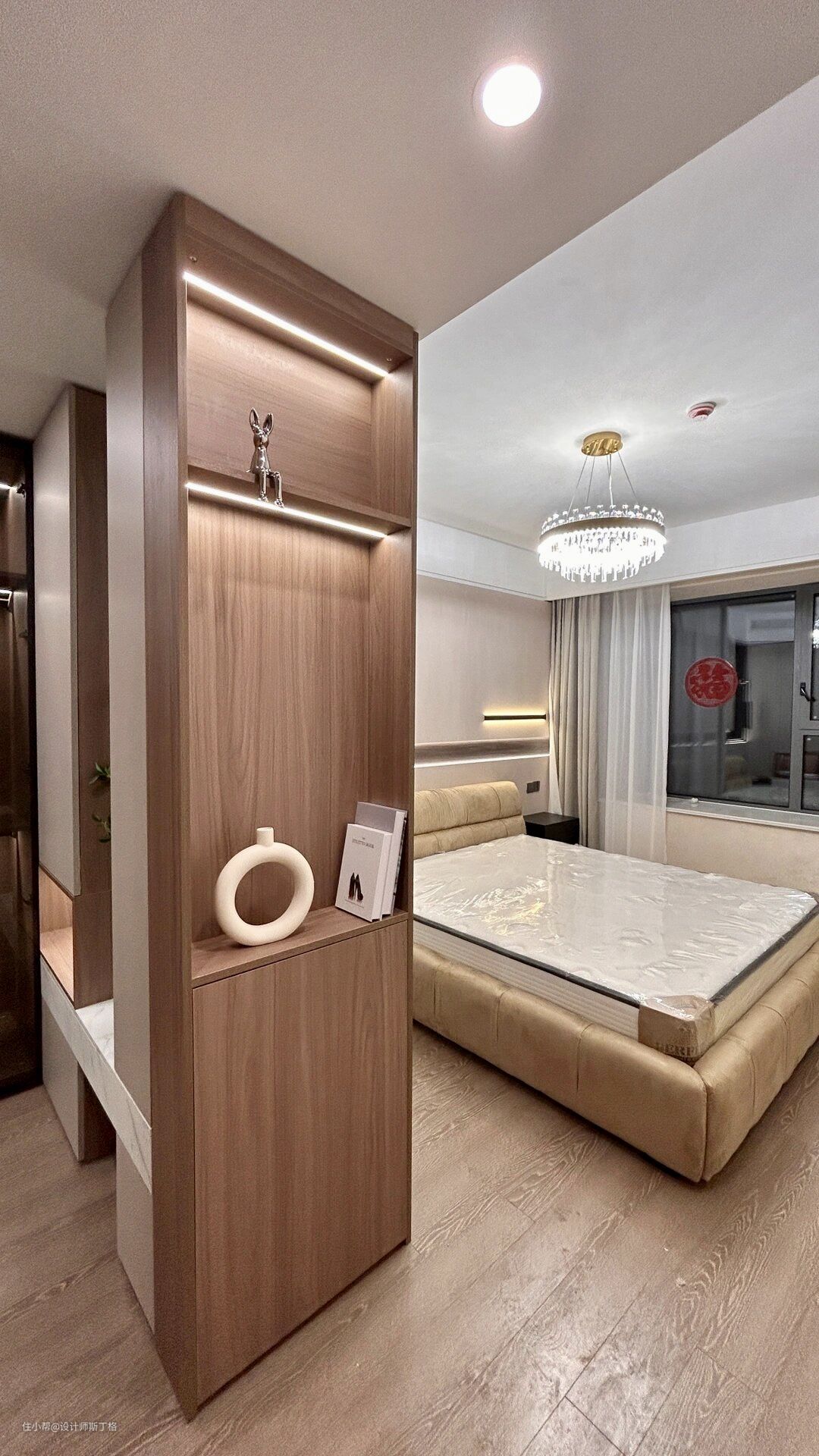墙饰与定制柜材质选用哑光木板,大面积灰咖色奠定素雅的空间气质。设置梳妆区、睡眠区、阳台区,丰富空间功能性,清晰流畅的空间动线,让生活有条不紊地进行。