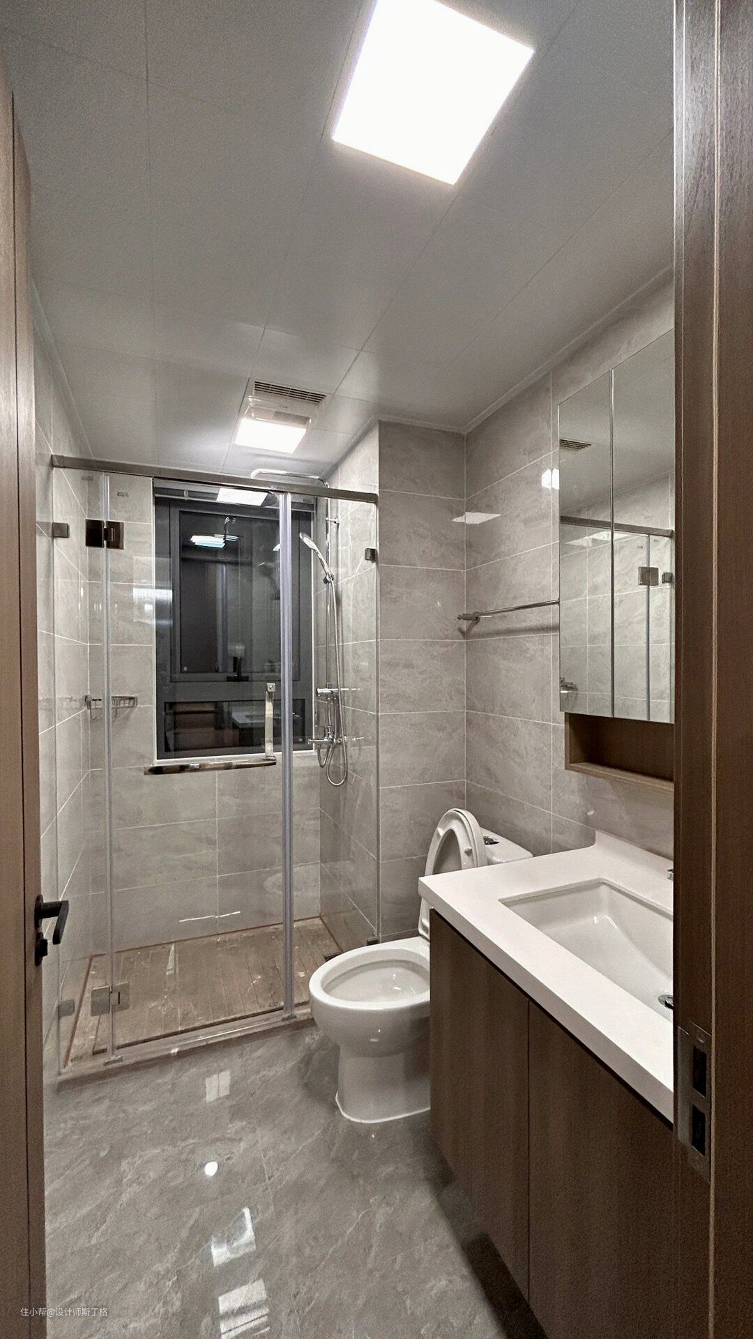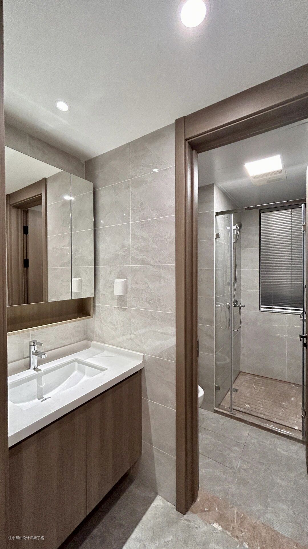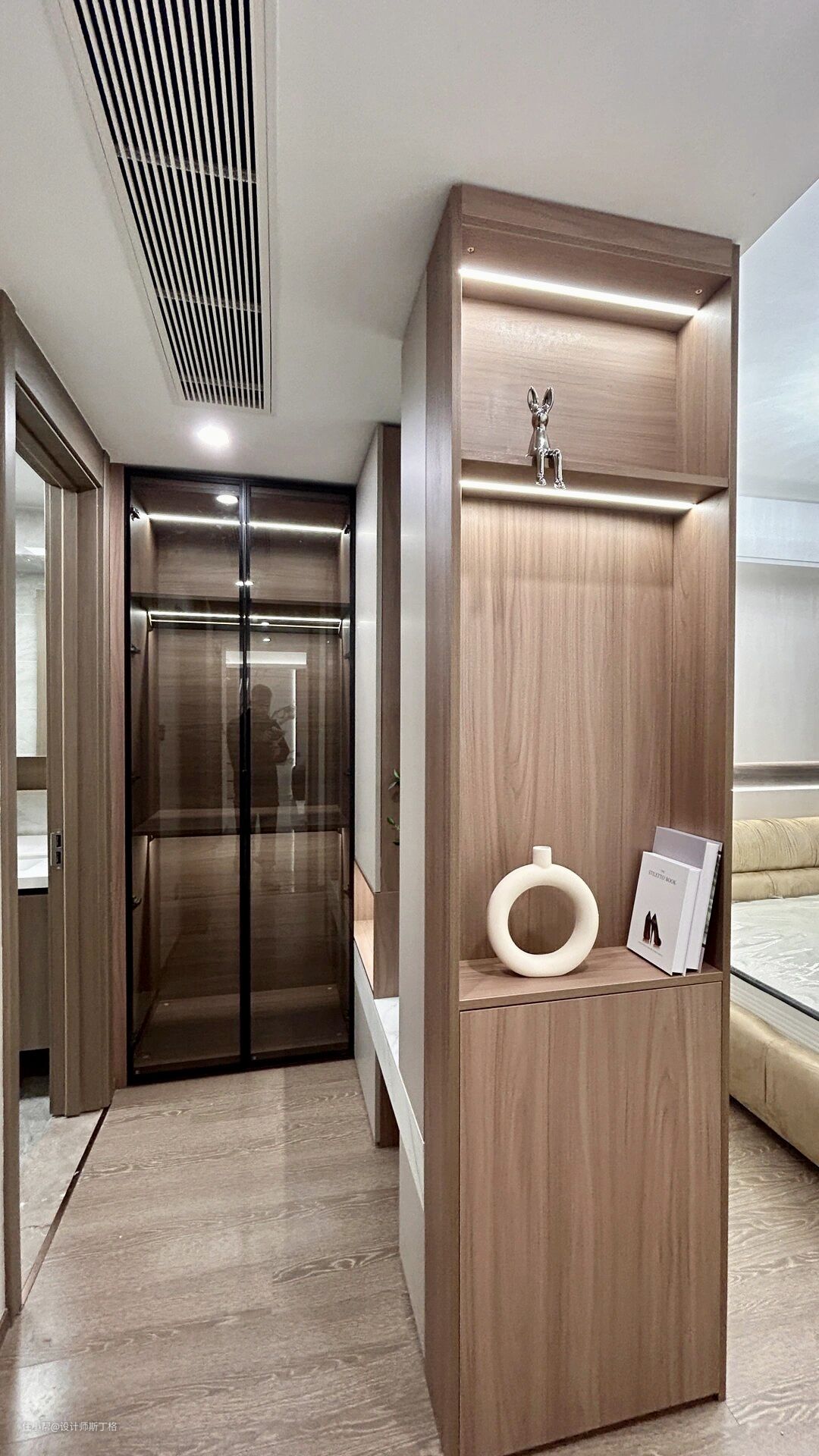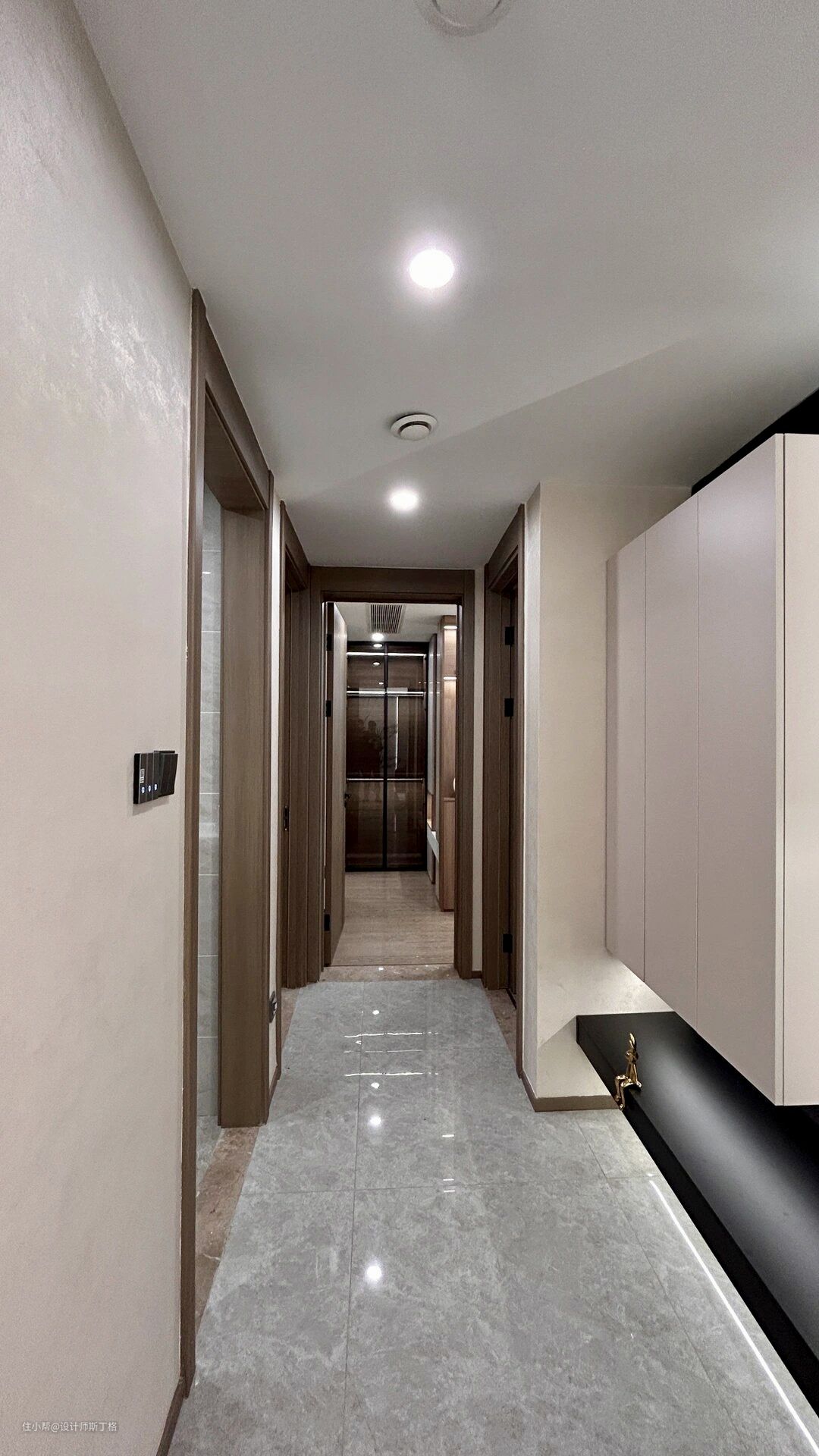 灰色通常会给人一种极简千练的印象,而原木通常带给人的感觉是温暖的氛围,将两者结合在一起,打造出具备时尚、现代感的舒适空间。 大理石的地面设计配合咖色的木材让整面鞋柜拥有了古典配色的优雅,天然材料的选取抵消了现代生活远离自然带来的疏离与割裂,人是自然的产物,只有在自然中才能真正放松自我。