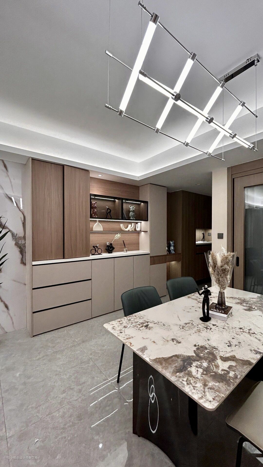 深色极简的岩板西餐桌尽显大气,柔光台面触感舒适,降低了硬朗空间的冰冷感。嵌入式酒柜,黑框灰玻璃的朦胧质感更显高级,灯带勾勒酒柜内部结构,视觉更立体。