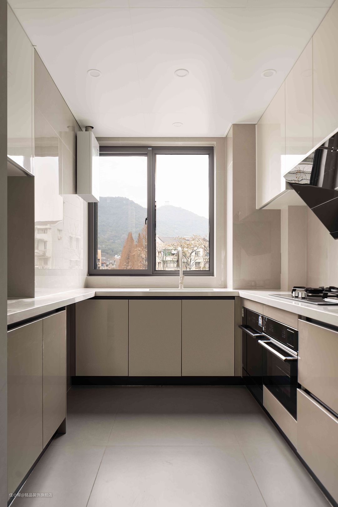 整个厨房呈U型空间布局,洗—切—炒合理分布,做菜更轻松。奶咖色UV高光橱柜,高级耐看又易清洁打理。柜门做了无拉手造型,视觉整体性更强。 #厨房 #橱柜 #收纳