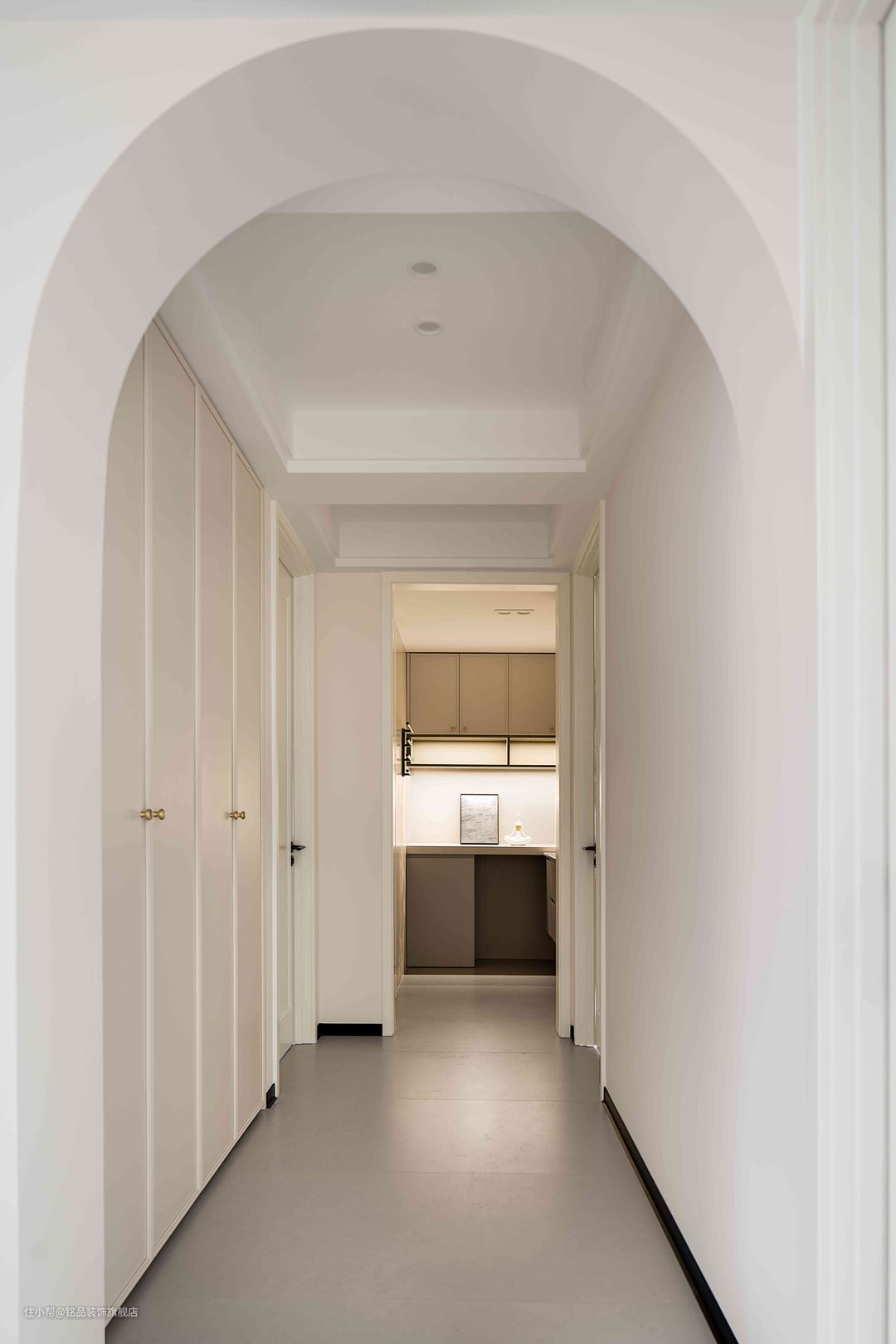新家融实用与颜值为一体,每个细节都被用心设计。大门右侧定制整排鞋柜,黄昏归家时,感应灯自动点亮下方放鞋区,外套和包包则挂在换衣区,隔绝户外的尘土。 动静区由过道相连,入口改造成弧形门洞,无论看多少遍都不减心动。见缝插针定制整墙储物柜,解决未来二十年收纳难题。 #玄关 #玄关柜 #弧形