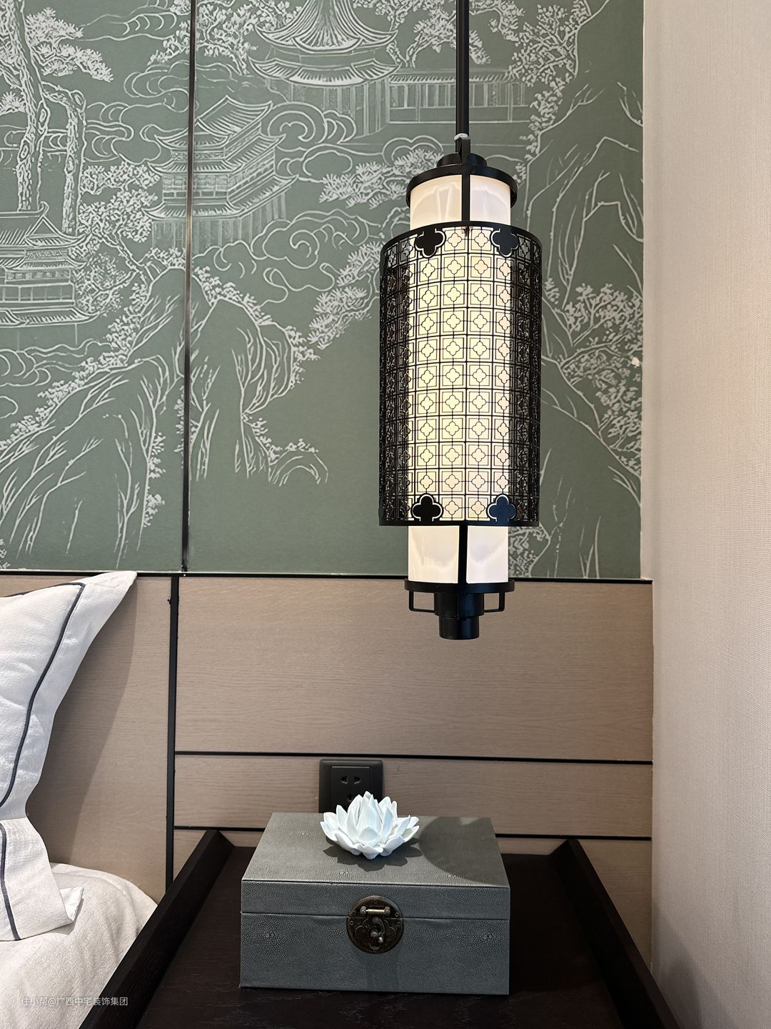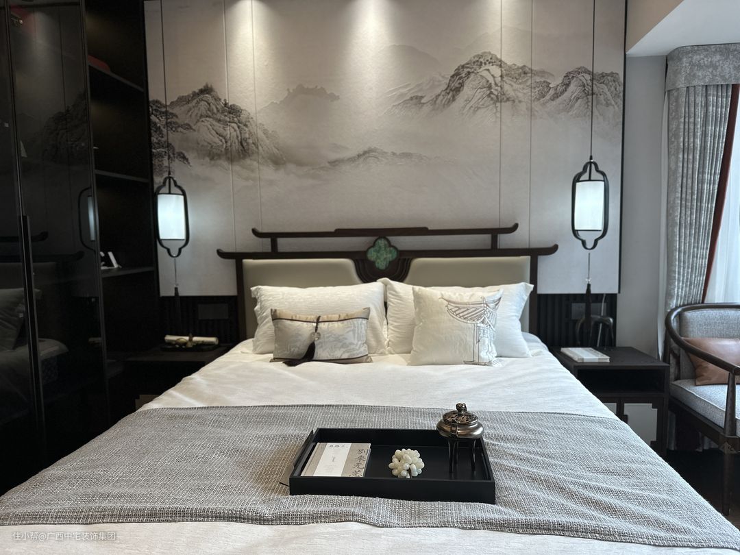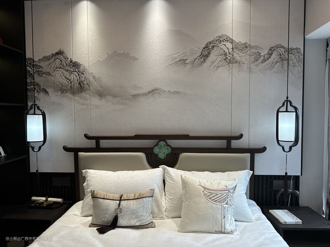 次卧以中式山水为主题,背景墙仿佛重峦叠嶂的山脉,灯光映衬下,山峰若隐若现,让人仿佛置身于祖国的大好河山之中。设计师巧妙运用线条与灯光的点缀,勾勒出丰富的层次感,将现代生活与传统元素完美融合,营造出自然、温馨、舒适的氛围。柔软的中式床铺、木质地板与整体设计步调一致,形成和谐统一的画面,让人在沉静的氛围中忘却生活的繁忙与疲惫,享受片刻的宁静与安逸。