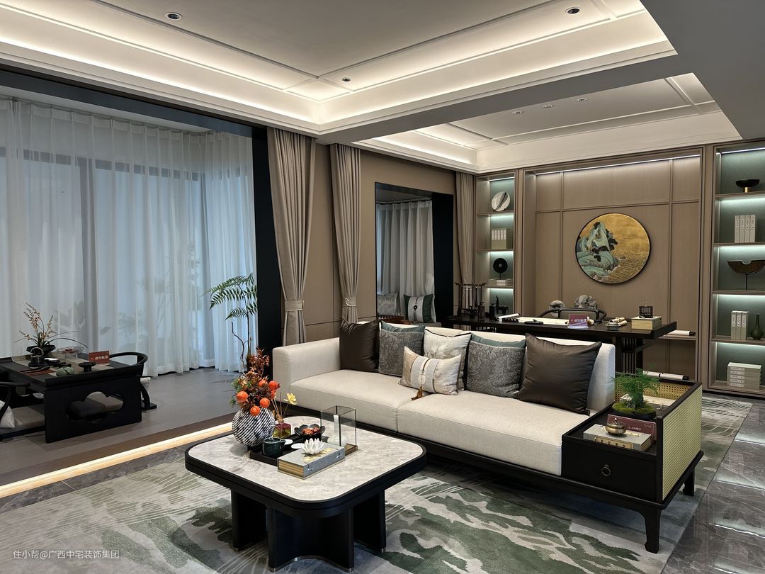 客厅中式元素随处可见,散发着古韵的魅力。舒适的中式沙发,搭配古韵十足的茶几,气势磅礴的挂画,都展现出中式传统基调的美,彰显出巍峨的胸襟。吊顶上的灯带环绕,为空间增添了一抹唯美的意境,当光线洒落在中式家具上,更显得温暖而舒适。