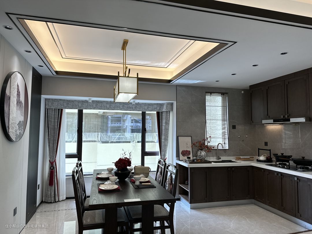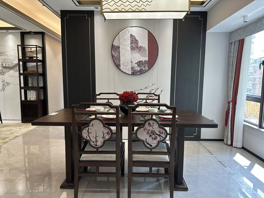 餐厅设计以新中式为主题,通过简洁硬朗的线条展现中式的霸气与力量。古色古香的餐椅与不同色彩的叠加,特别是中国红的运用,为餐厅增添了喜庆与活力的氛围。长方形餐桌作为空间的核心,营造出和谐的用餐环境,让家人围坐其间,享受美食的同时,也感受着中式文化的韵味与温度。