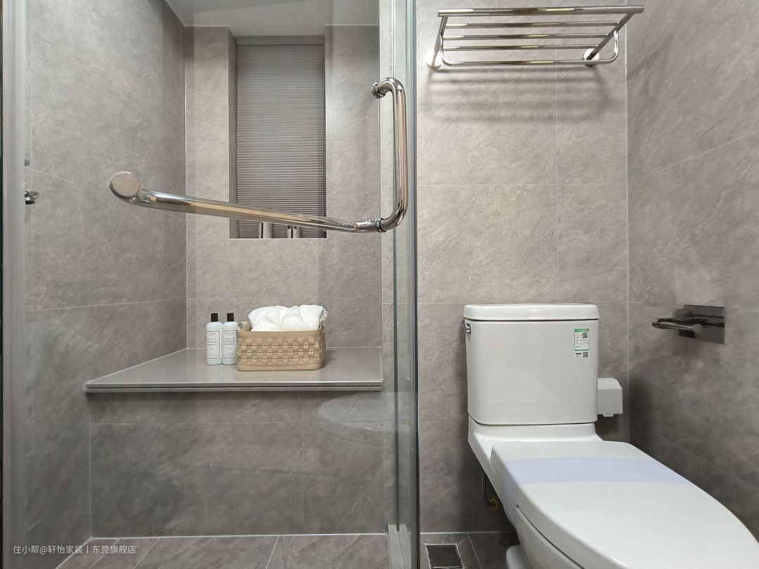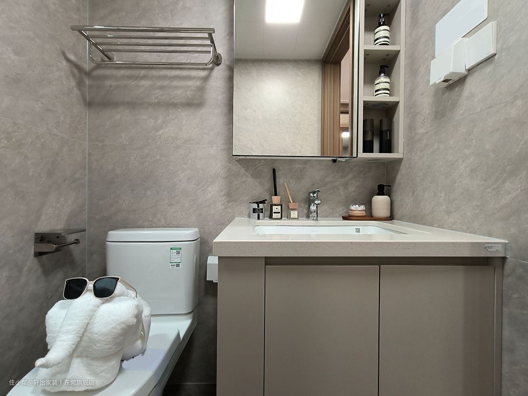 墙地通铺灰色柔光砖,让空间整体性更高。白色铝扣板吊顶,缓解顶面压抑, 同时防潮防湿。 镜柜搭配开放格,让洗漱用品归纳有序,日常取物更方便。浴室柜侧边融入壁龛设计,放置手机,不占整体空间。