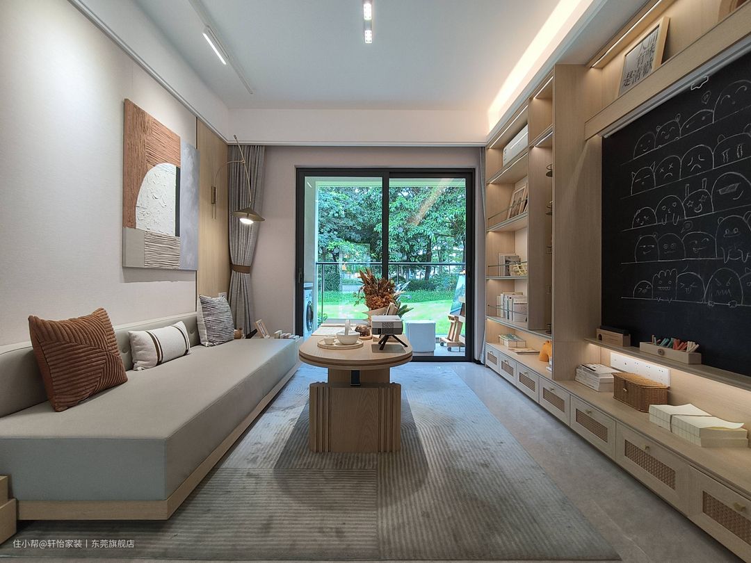 儿童房虽不大,却完美贴合生活形态。榻榻米与窗平齐,床下做收纳,让渡空间用于打造学习区。 床头墙以奶茶色为底,辅以开放格、木质洞洞板、散件,灵活布局立面收纳,扩充容量,同时于下方边框镶嵌灯带,梳理画面层次。 门侧植入的珐琅板,打造画板、记事区,能随意涂画擦洗,赋予千篇一律的洞洞板以个性。