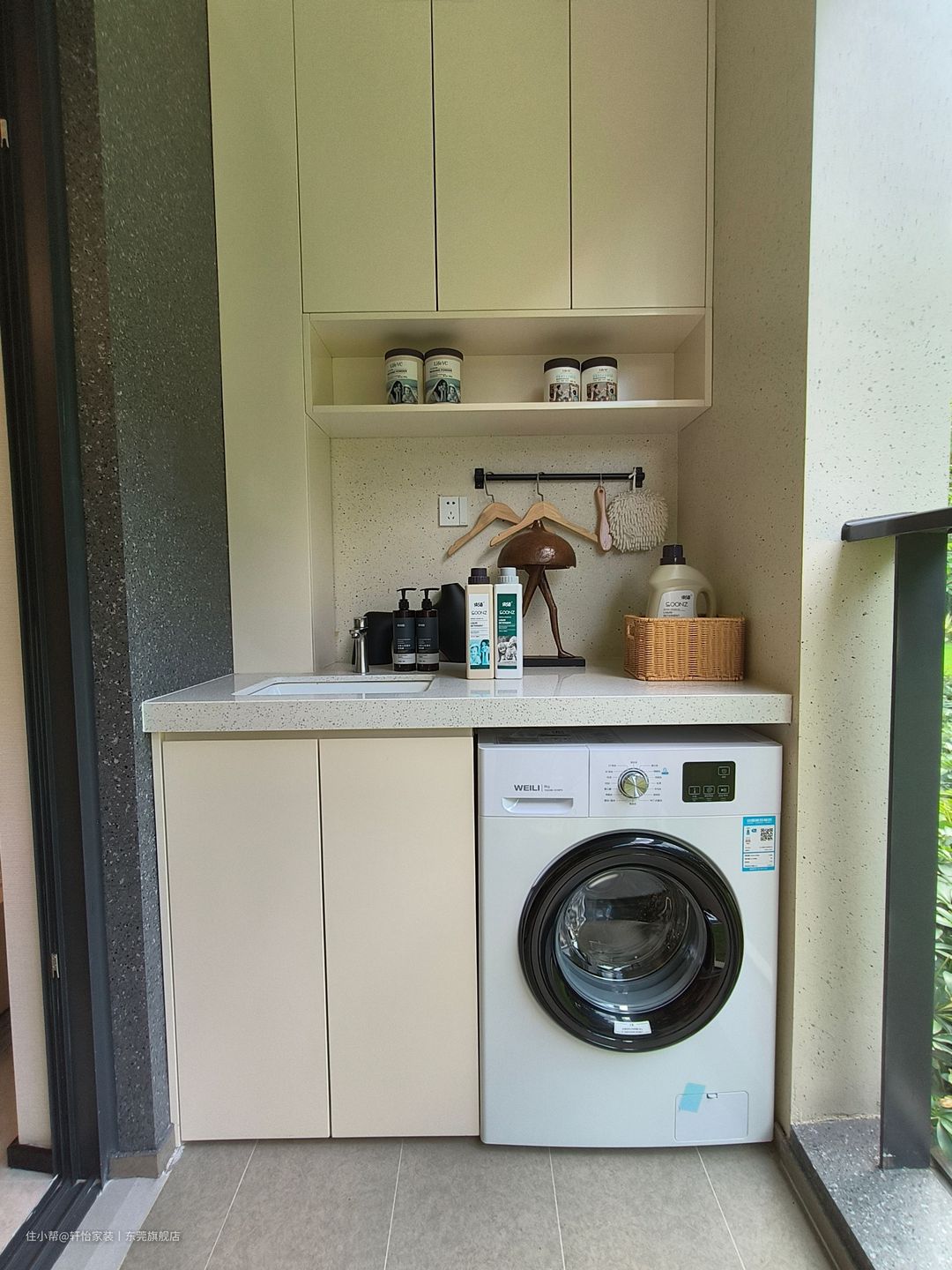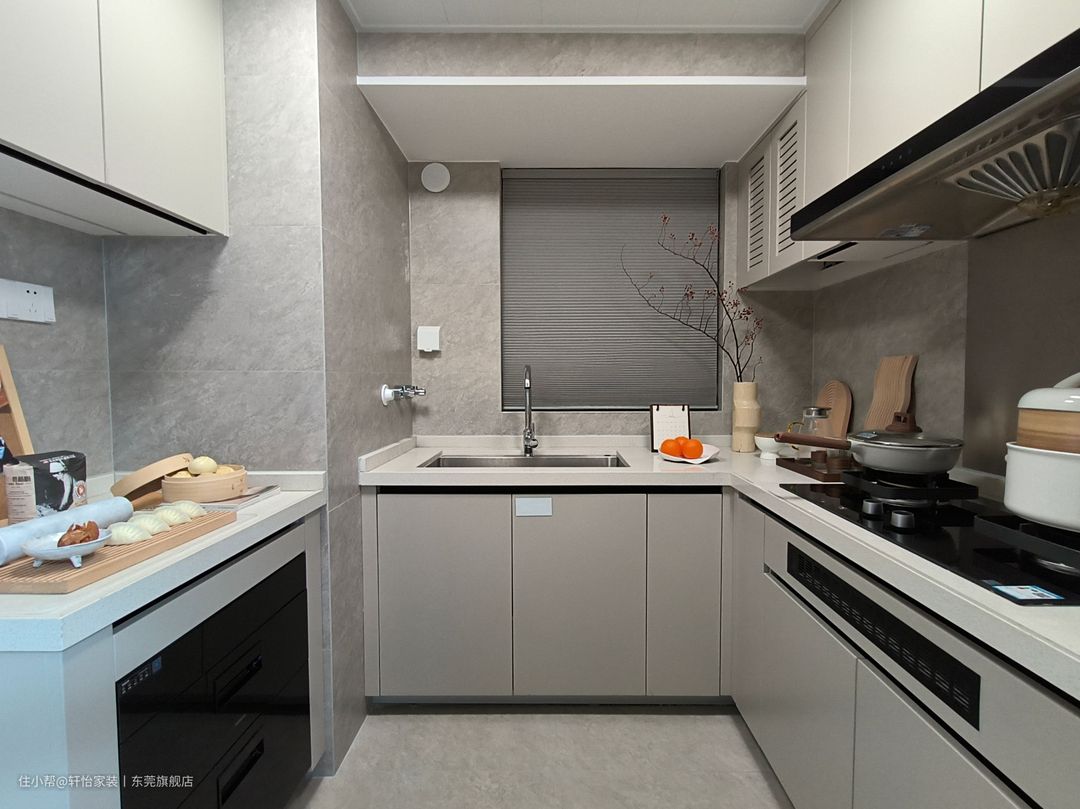 厨房化零为整,沿梁柱打造U型布局,动线清晰流畅,提升下厨幸福感。 利用梁与门框之间的位置放置一方台面,嵌入烤箱,满足业主的烘焙爱好,同时也能担任西厨的角色。 增设不锈钢做后挡板,避免柔光砖对油烟的藏匿,日常打理清扫更便捷,同时在烟道上融入置物架,收纳瓶瓶罐罐,保持台面整洁。