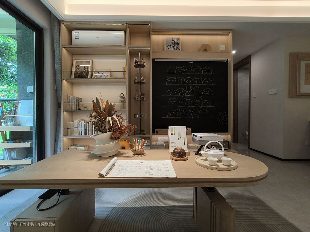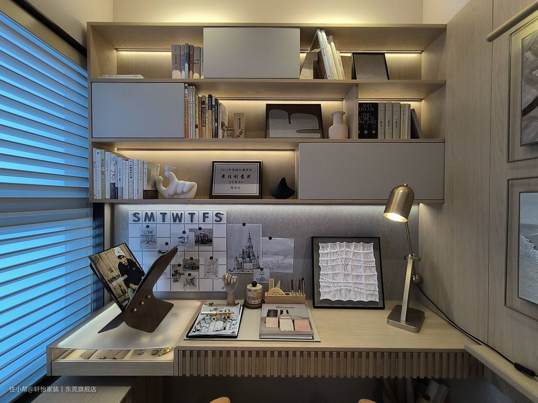 将最小的一间卧室改造为书房,一条条灯带犹如一道道星河,散落出波光潋滟,在空间内穿梭,产生流动之感。 书柜柜体藏露有序,纯白挡板错落摆放,结合间歇出现的灯带,明暗深浅渐变,自成一副光明与阴翳的礼赞。 利用香格里拉帘代替传统窗帘,柔化光线的同时,自由调整自然光尽量,打造舒适的工作学习环境。