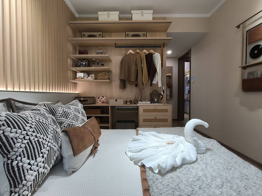 木栅格与银灰墙板覆上背景墙,腰部游走的灯带,缀入光影的轻盈 ,营造简约舒服却又不失个性的睡眠空间。 飘窗利用木质窗套进行包裹,融入开放格,顶部增设筒灯,造就一处安静的阅读区,闲时赏景品茶,自得生活其乐。 右侧打造木质开放层架,根据存放物品规划相应五金配件,系统归纳衣服,完善各种使用情景,发挥空间最高效能。