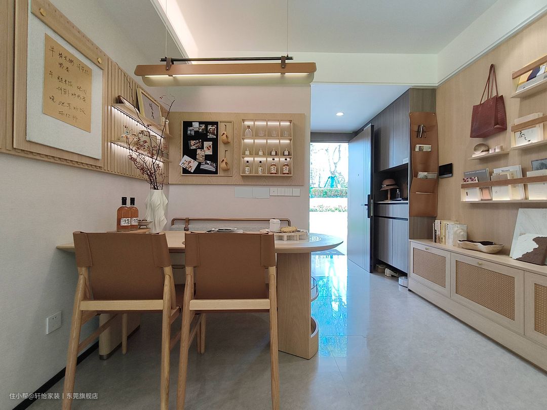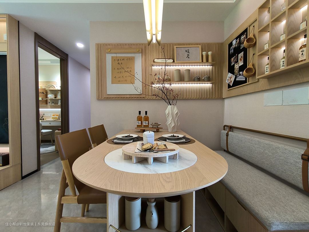 沿腰线而走的木栅格,延续了视觉,化尴尬转角为造型,嵌入层架、挂板,拉开立面的起伏感。 折叠款餐桌承担多项功能,收纳小件不在话下,线条优雅的餐椅,搭配实用好看的长凳,让餐厅布局更精致。