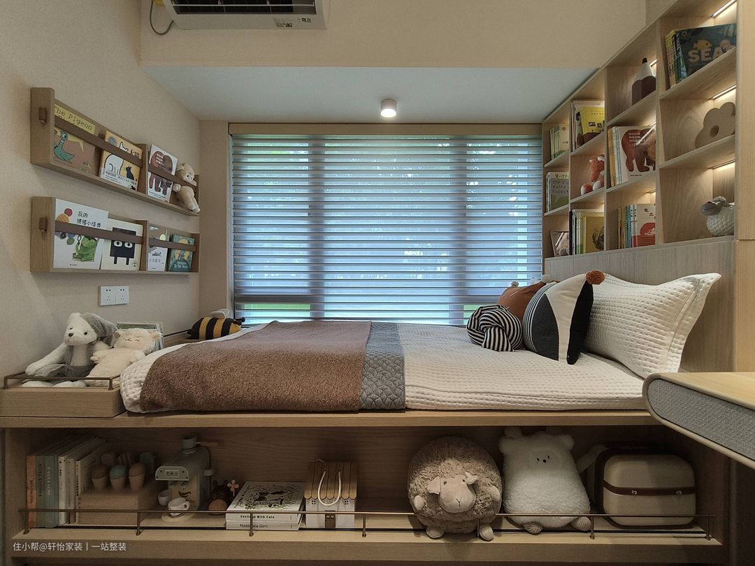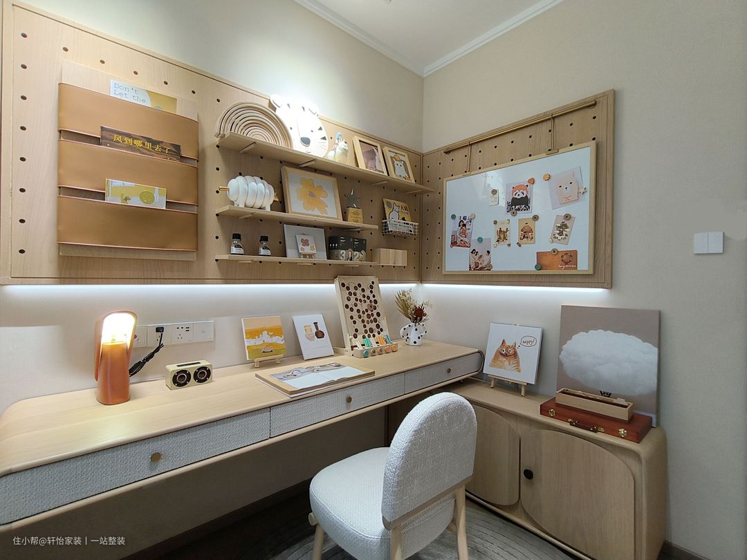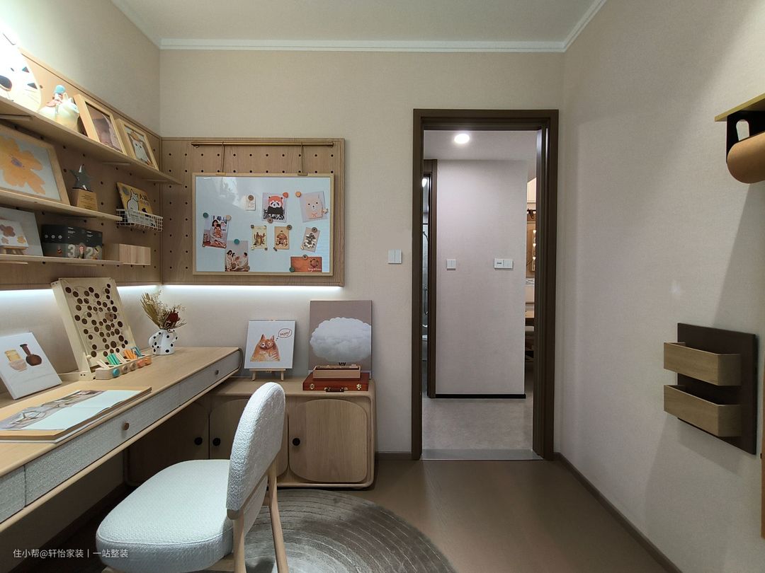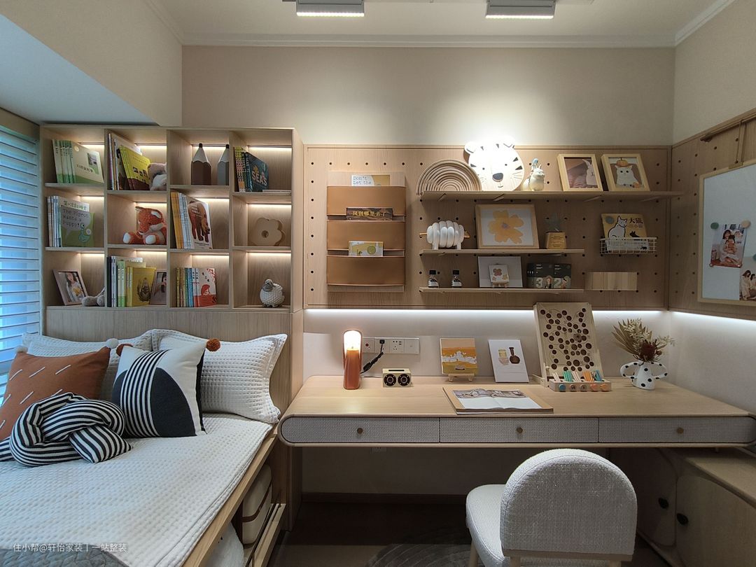 儿童房虽不大,却完美贴合生活形态。榻榻米与窗平齐,床下做收纳,让渡空间用于打造学习区。 床头墙以奶茶色为底,辅以开放格、木质洞洞板、散件,灵活布局立面收纳,扩充容量,同时于下方边框镶嵌灯带,梳理画面层次。 门侧植入的珐琅板,打造画板、记事区,能随意涂画擦洗,赋予千篇一律的洞洞板以个性。