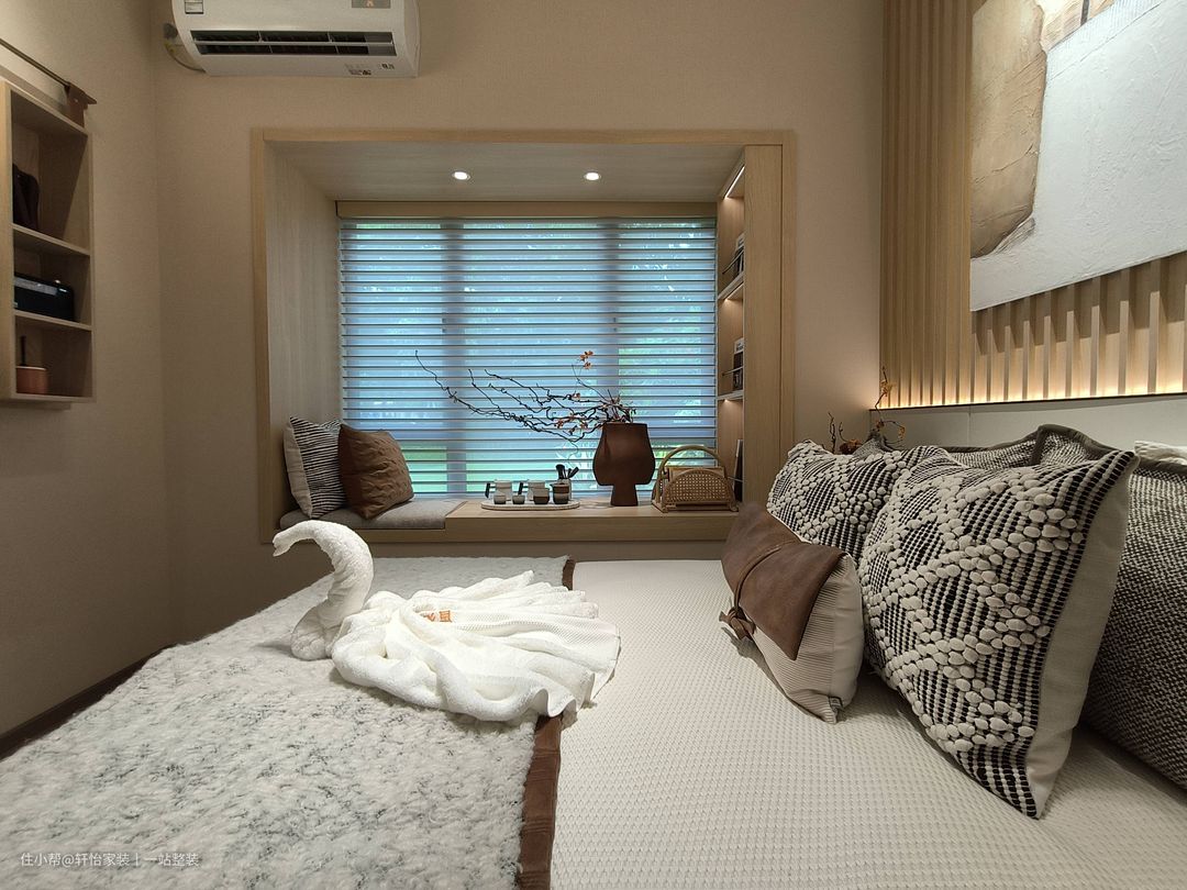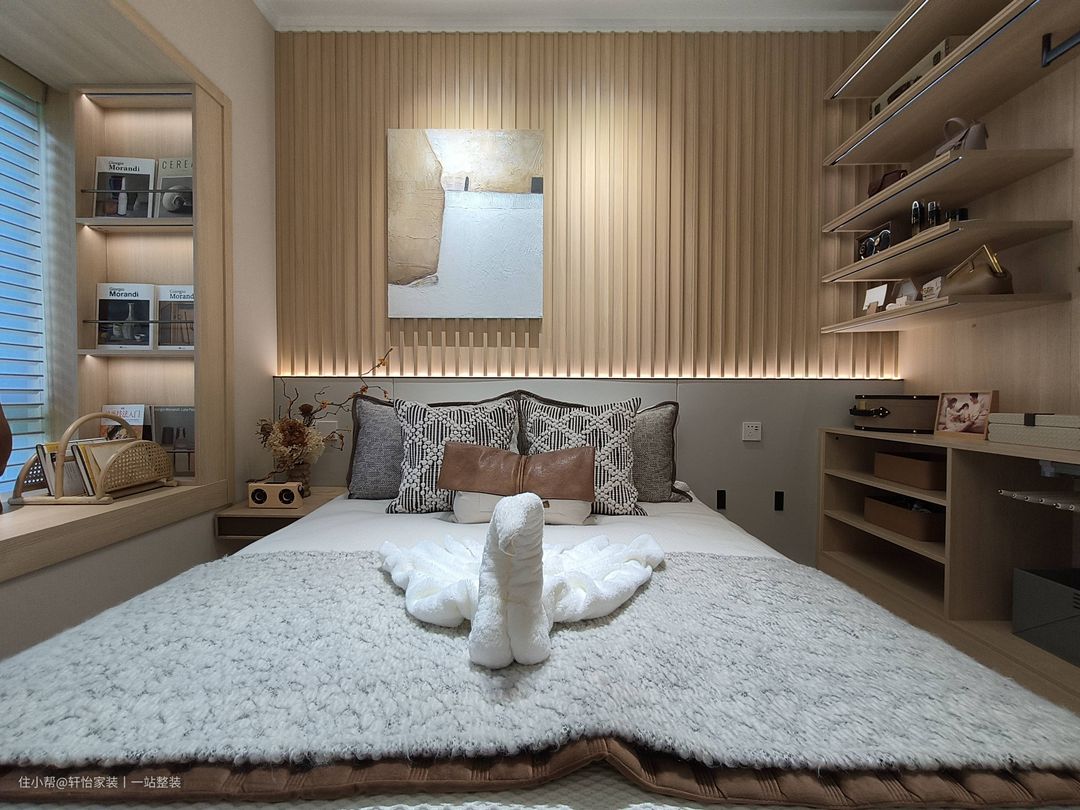木栅格与银灰墙板覆上背景墙,腰部游走的灯带,缀入光影的轻盈 ,营造简约舒服却又不失个性的睡眠空间。 飘窗利用木质窗套进行包裹,融入开放格,顶部增设筒灯,造就一处安静的阅读区,闲时赏景品茶,自得生活其乐。 右侧打造木质开放层架,根据存放物品规划相应五金配件,系统归纳衣服,完善各种使用情景,发挥空间最高效能。