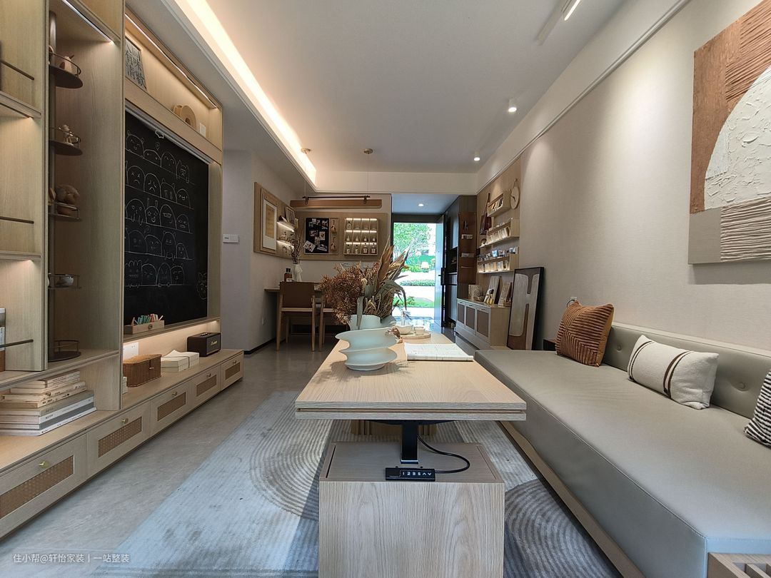 为给予客厅开阔感,顶面采用双眼皮边吊+无主灯设计,尽可能保持空间原始高度,放大空间于无形。 沙发墙涂刷浅灰紫墙漆,结尾衔接金属线与木饰面板,在朴素空间中堆叠层次。纤细壁灯点缀,与顶面射灯的光影交错,为整面墙体镶上一抹柔光。 电视墙的设计延续整屋的原木主题,整面电视柜融入书架、黑板、幕布,给孩子一方自由挥洒想象的视听之地。