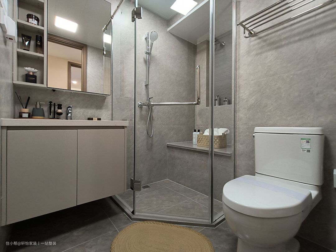 墙地通铺灰色柔光砖,让空间整体性更高。白色铝扣板吊顶,缓解顶面压抑, 同时防潮防湿。 镜柜搭配开放格,让洗漱用品归纳有序,日常取物更方便。浴室柜侧边融入壁龛设计,放置手机,不占整体空间。