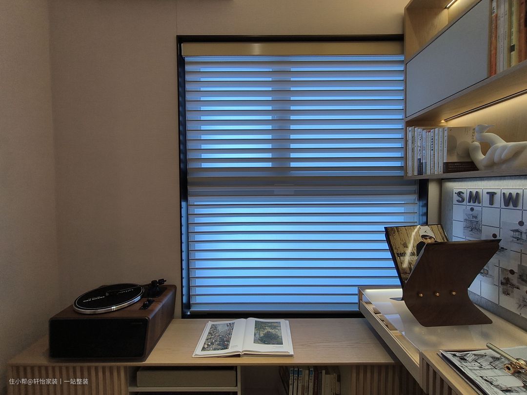 将最小的一间卧室改造为书房,一条条灯带犹如一道道星河,散落出波光潋滟,在空间内穿梭,产生流动之感。 书柜柜体藏露有序,纯白挡板错落摆放,结合间歇出现的灯带,明暗深浅渐变,自成一副光明与阴翳的礼赞。 利用香格里拉帘代替传统窗帘,柔化光线的同时,自由调整自然光尽量,打造舒适的工作学习环境。