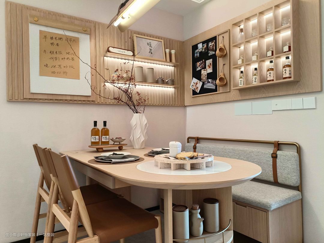 沿腰线而走的木栅格,延续了视觉,化尴尬转角为造型,嵌入层架、挂板,拉开立面的起伏感。 折叠款餐桌承担多项功能,收纳小件不在话下,线条优雅的餐椅,搭配实用好看的长凳,让餐厅布局更精致。