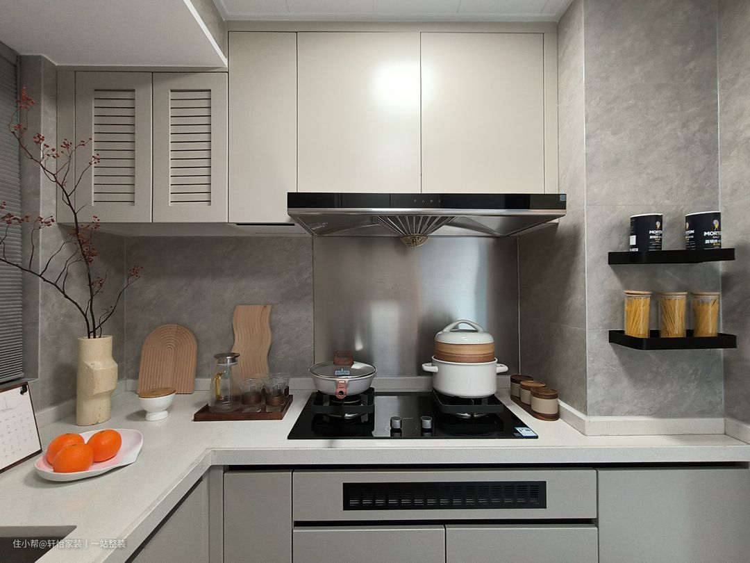 厨房化零为整,沿梁柱打造U型布局,动线清晰流畅,提升下厨幸福感。 利用梁与门框之间的位置放置一方台面,嵌入烤箱,满足业主的烘焙爱好,同时也能担任西厨的角色。 增设不锈钢做后挡板,避免柔光砖对油烟的藏匿,日常打理清扫更便捷,同时在烟道上融入置物架,收纳瓶瓶罐罐,保持台面整洁。