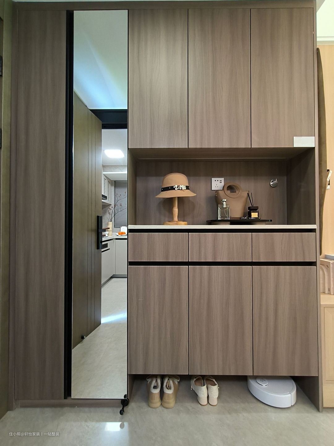 玄关柜材质、肌理丰富,刻画深浅变换的纹理,演绎木质的温润,同时镜面、中部留空的通透,凸显设计编排的功力。