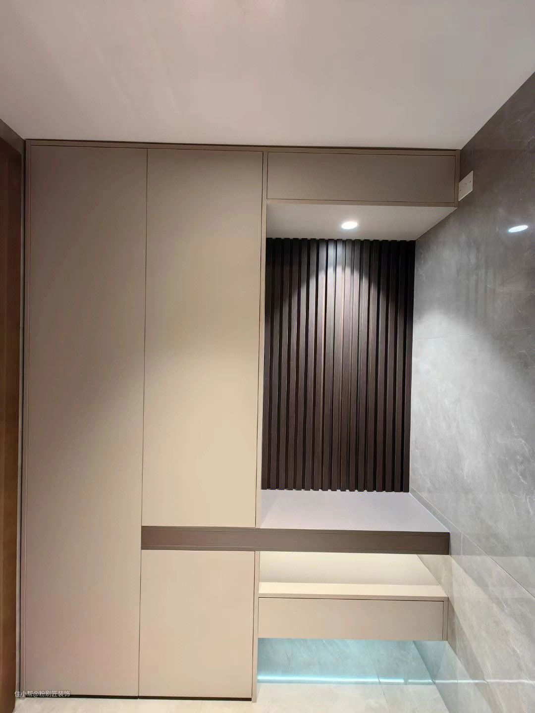 满墙电视柜结合边吊筒灯打光营造氛围感,镂空柜体防放置摆件,作为展示,其余后期储放生活需要用品, 鞋柜穿插设计,木格栅作为搭配,入住后放置绿植加上灯光的辅助,效果拉满