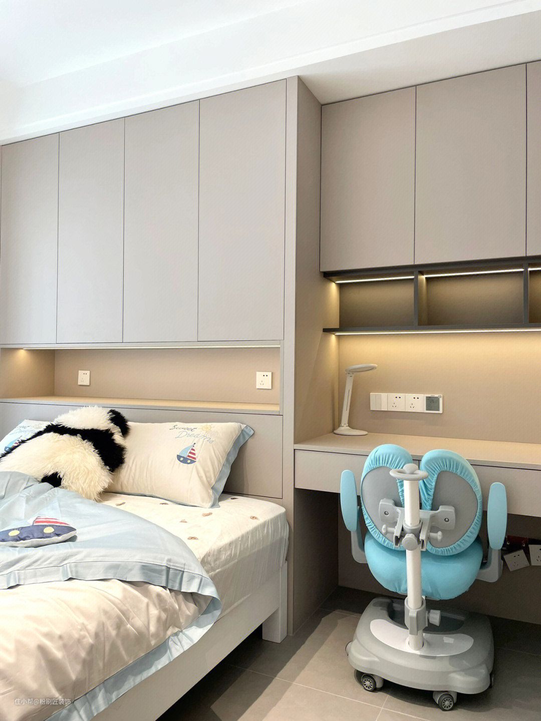 局限的空间最大化的设计,衣柜与书桌一体设计,选用排骨架,柜体作为床头,柜体中间后期可以放置用品,1米的书桌上柜书柜满足日常学习需求
