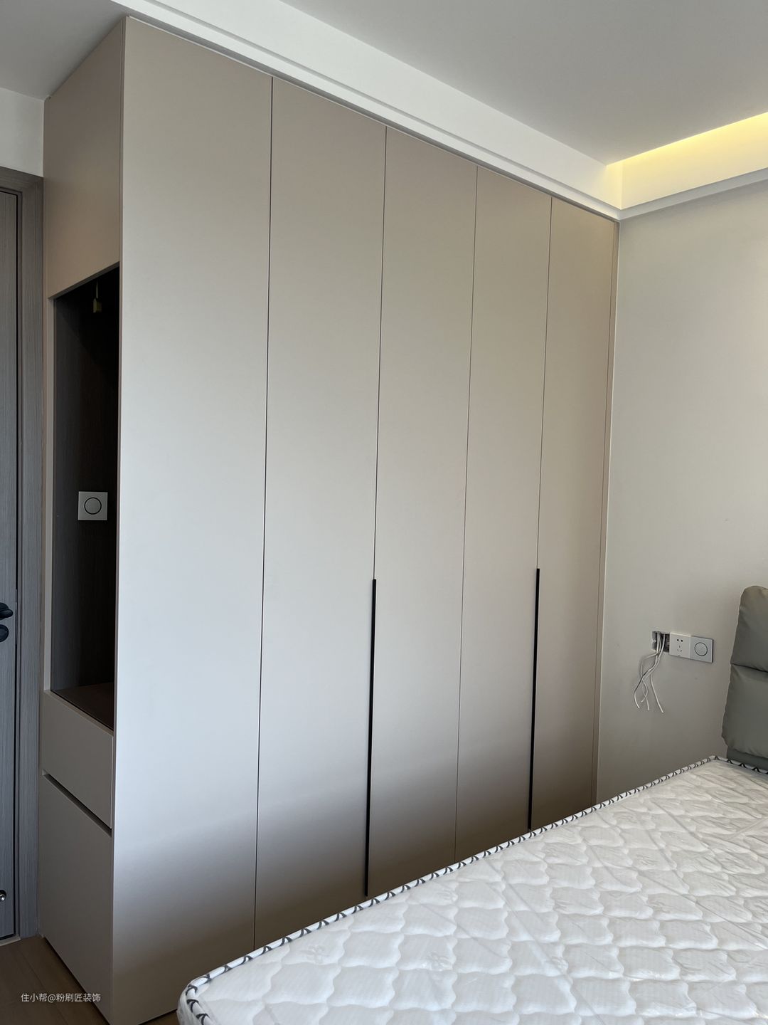 衣柜侧面后期可以挂常用衣物,灯具开关放置在侧面,一门到顶的衣柜简约大气,吊顶的反光灯槽打光满满的氛围感,1800*2200的皮质双人床更显质感
