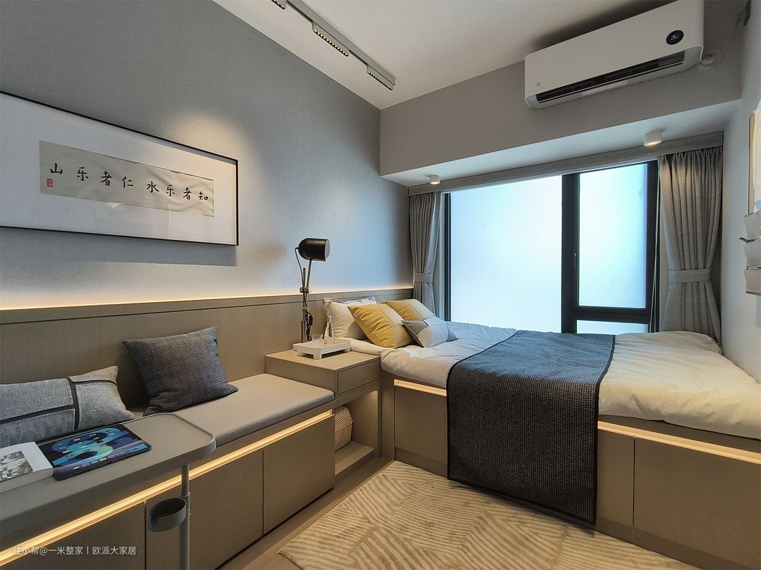 次卧延续主卧的简约设计风格,灰白色的墙体,不同的是,次卧连接飘窗做了榻榻米,增加了收纳功能。榻榻米紧贴床头柜,床头柜延伸出来做了沙发柜,进一步增加了收纳,充分的利用空间。 飘窗进来的光线和灯光光线结合,照耀着墙体上的布艺收纳袋,清晰的倒影和垂挂的绿植,非常的清新,且富有文艺气息。