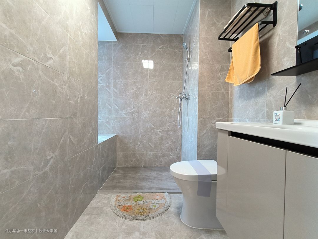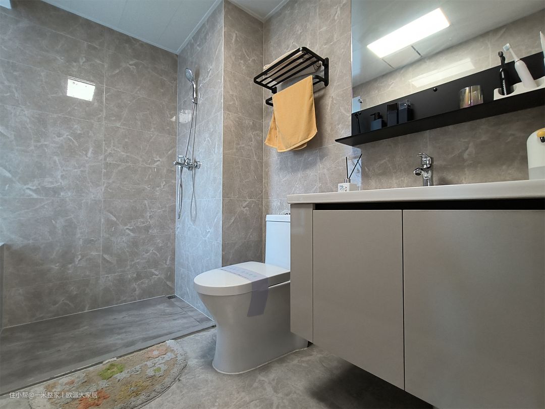 为了保护屋主的隐私问题,设置了主卫,还能避免用卫高峰。灰色花纹瓷砖通铺,淋浴区、马桶、洗漱区没有进行干湿分离,空间非常的明亮开阔。淋浴区摆放上吸水毯子,保证洗漱区和如厕区的干燥,同时方便日常清理。 悬挂镜柜和洗手柜满足日常物品收纳,洗手柜侧边做了开放格嵌入式收纳,放置卫生纸等物品。下方悬空设计也可以放置盆,鞋子等物品,保证空间的整洁和舒适度。