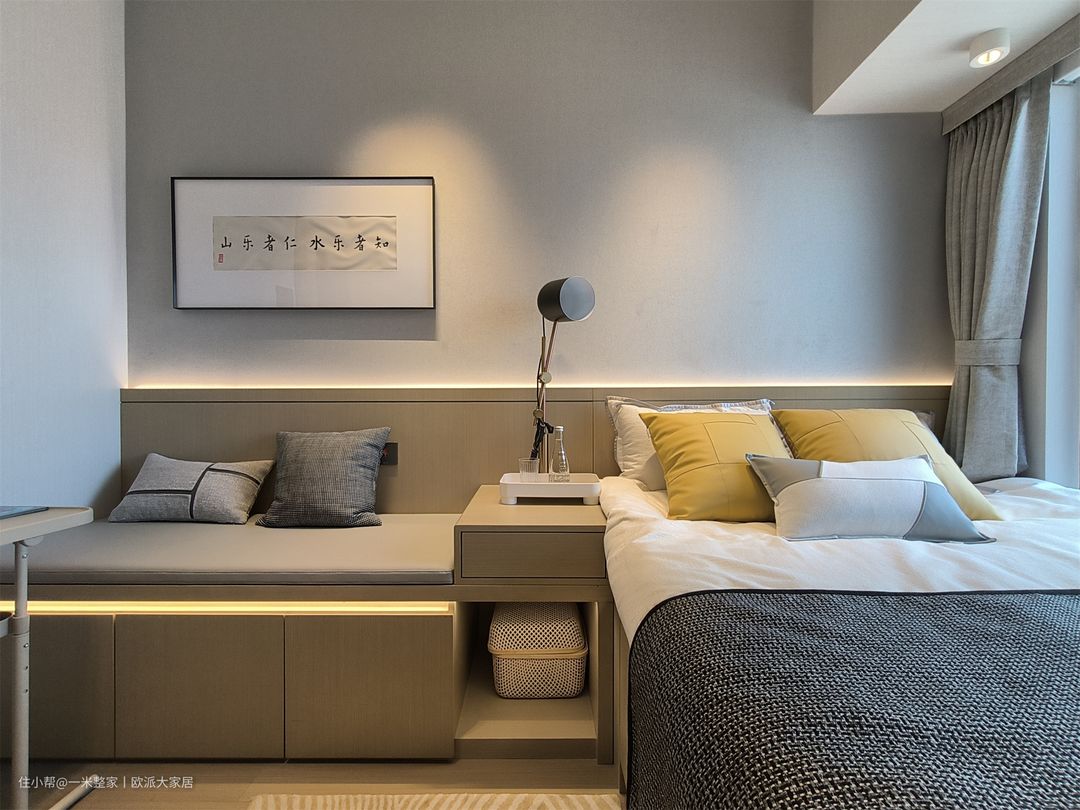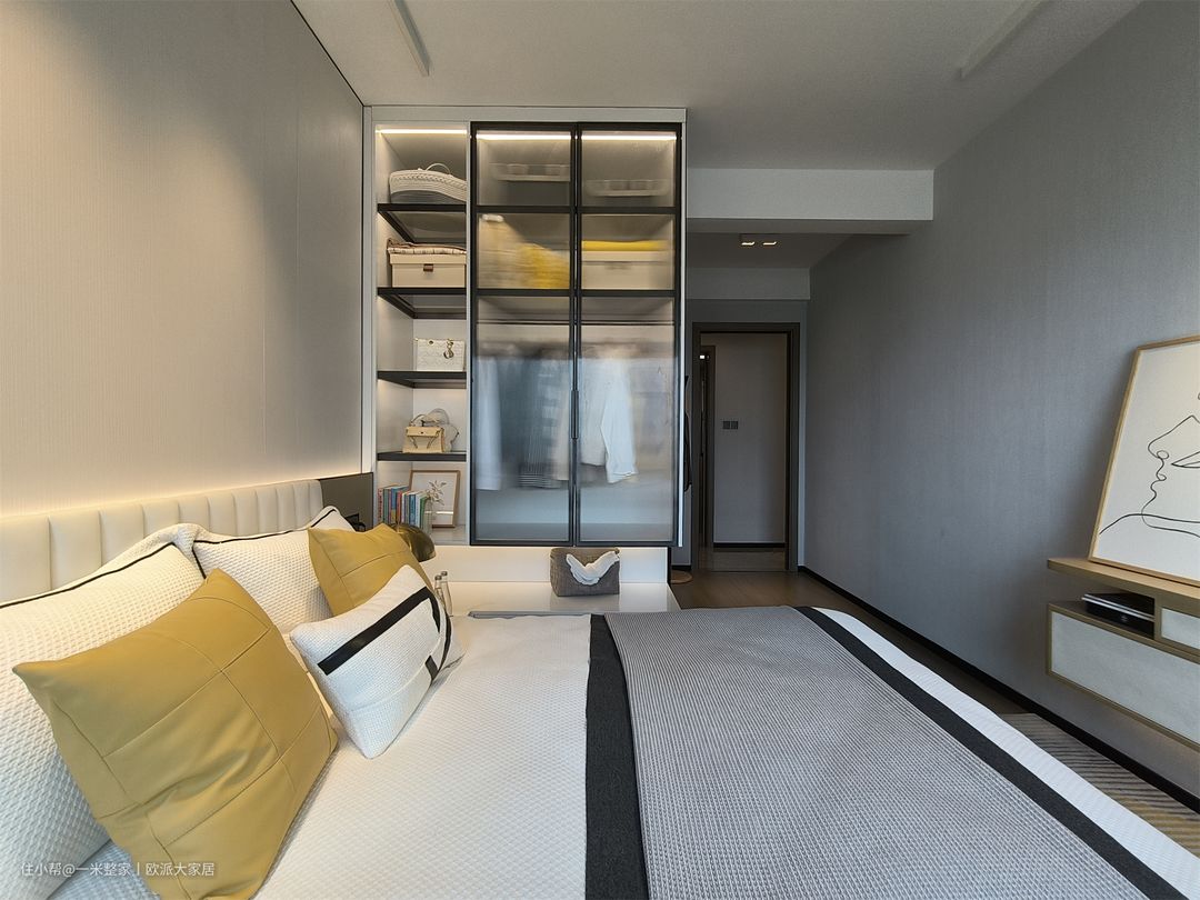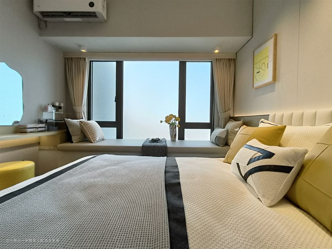 主卧主体是黑白灰色调,搭配跳脱的黄色,给休憩环境增添了一抹温暖明亮的色彩。四周小射灯的暖光照射下来,很有氛围感。收纳柜开放格和玻璃封闭式的设计,朦胧的美感和实用性同时get! 5平米的飘窗被利用起来了,铺上一层米白色沙发垫,放上一张茶垫,摆放着鲜花绿植,一片清新自然的休闲区就出来了。坐在上面,窗外的美景一览无余,喝着茶,尽享生活的乐趣。飘窗延伸出来还连接着一字型的梳妆台,女主人可以在此梳妆打扮,一整天的好心情就从此处开始! 意式极简沙发,清晰流畅的线条,两头摆放着简单小巧的床头柜,满足主人的日常收纳和生活小爱好。搭配简约的家具和线条流畅的设计,营造出舒适宜人的休憩空间。此外,使用白色的家具和姜黄色的抱枕来与灰白色墙面形成对比,增加整体空间的层次感。